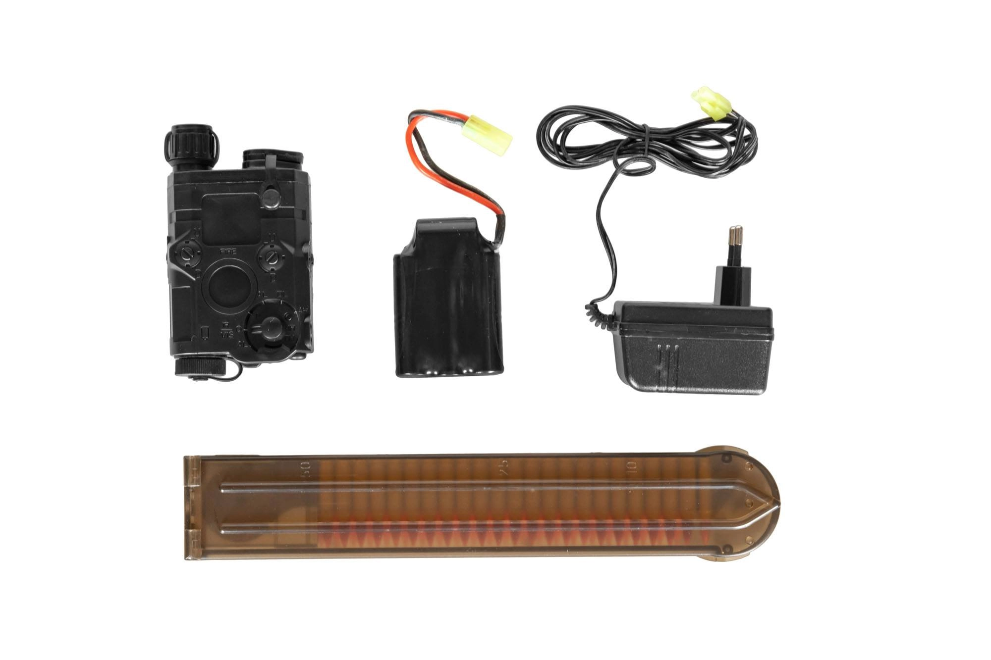 Zastosowano tu specjalnego kształtu chwyt pistoletowy, który jest nieco grubszy niż chwyty standardowo montowane w replikach “emek”. Replika posiada ramową, składaną na bok korpusu kolbę, zkaończoną gumowa stopką. Dedykowany akumulator (dołączony do zestawu) idealnie mieści się wewnątrz atrapy puszki AN/PEQ, która również znajduje się w zestawie.