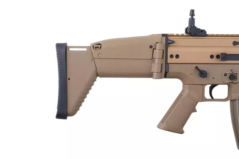 Bardzo dobrze wykonana replika szturmowego karabinka FN HERSTAL SCAR-L produkcji CyberGun. Replika wykonana z metalu oraz wysokiej jakości polimeru gwarantuje wysoką odporność na warunki w jakich będzie używana. Części metalowe to m.in.: górna część korpusu, przyrządy celownicze oraz zaczepy zawieszenia taktycznego. Warto zwrócić uwagę na stalowy tłumik płomieni nakręcony na gwint 14mm CCW. Regulowana i składana kolba wykonana jest z polimeru, tak jak dolna część korpusu z chwytem pistoletowym. Na korpusie repliki umieszczone są oznaczenia producenta palnego odpowiednika FN HERSTAL oraz kaliber 6mm.