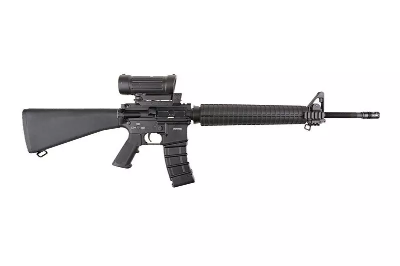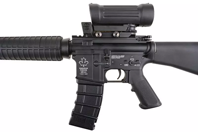Tak jak w palnym odpowiedniku, nie znajdziemy w zestawie górnego chwytu transportowego, ale zamiast niego otrzymujemy dołączoną dedykowaną optykę. Jest to replika lunety typu Elcan, ze stałym powiększeniem 4x, zaopatrzona w montaż na standardową szynę RIS 22mm. Niezwykle solidna, wykonana z metalu, ponadto posiada korpus pokryty gumą, co zwiększa jej wytrzymałość i odporność na uszkodzenia mechaniczne.