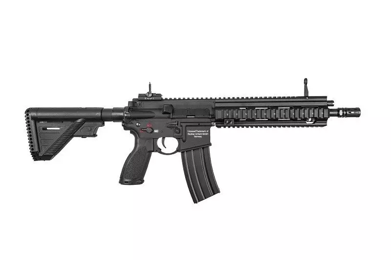 Elektryczna replika karabinka szturmowego Heckler&Koch HK416 A5 wykonana została w przeważającej części z metalu. Elementy wykonane z wytrzymałego tworzywa sztucznego to chwyt pistoletowy oraz kolba. Na karabinek naniesione zostały licencjonowane oznaczenia Heckler&Koch.