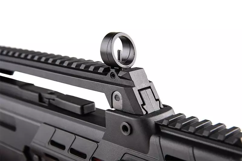 Chwyt przedni jest wyposażony w szyny montażowe RIS zgodne ze standardem 22mm, pozwala to na montaż szerokiej gamy akcesoriów dodatkowych od latarek, przez wskaźniki laserowe itd. W chwycie przednim znajduje się również przestrzeń dedykowana na akumulator.
