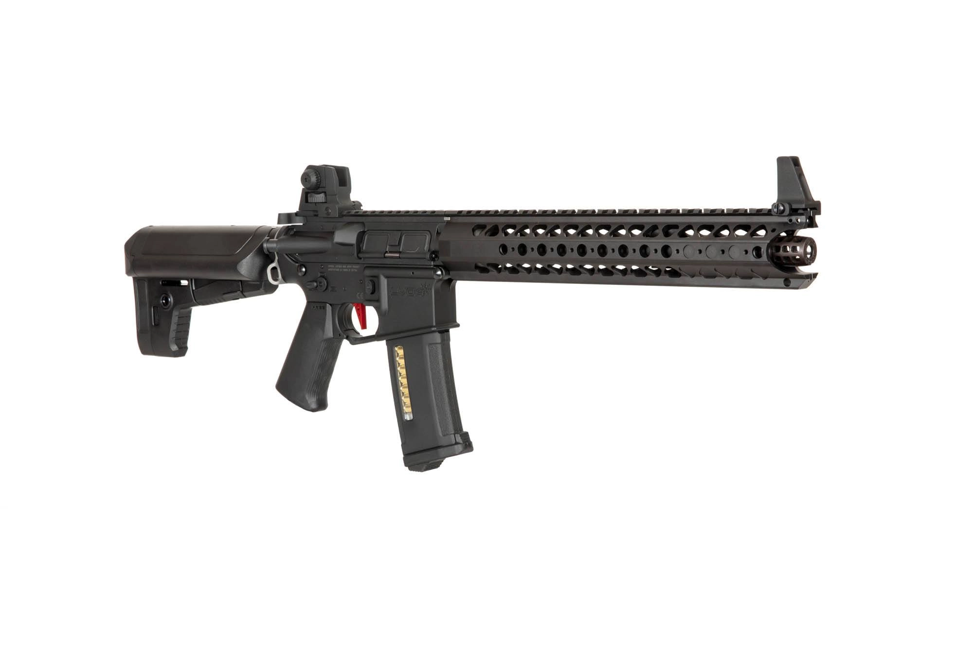 LVOA-S CQBR to karabinek oparty na licencjonowanym modelu War Sport LVOA-S. Replikę wyposażono w długą szynę Licensed War Sport Manufacturing® LVOA-S. Aluminiowy, matowo wykończony korpus został opatrzony oznaczeniami War Sport, jest kompatybilny ze standardowymi magazynkami AR/M4 (STANAG). Kolejne jego zalety to obustronny selektor trybu ognia oraz działający bolt-catch, który ułatwi dostęp do systemu hop-up repliki. Replika posiada teleskopową kolbę o regulowanej długości, wewnątrz której możemy zmieścić akumulator w kilku różnych konfiguracjach. Na kolbie znajdziemy zaczepy do mocowania pasa nośnego, w tym 2 typu QD – szybkiego wypięcia.