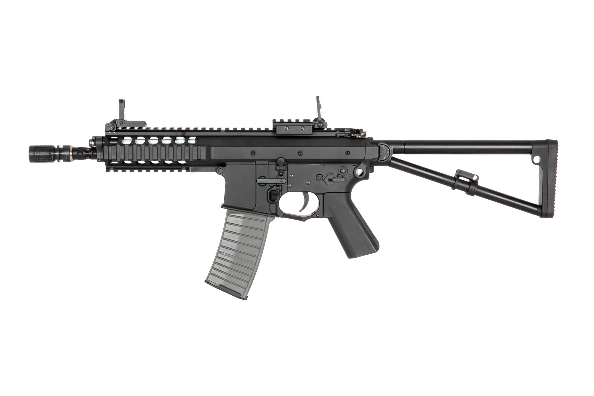 Replika posiada składaną na bok kolbę, która dodatkowo zmniejsza wymiary repliki do minimalnej (450 mm). Na górnej szynie montażowej, zamontowane są instrumenty celownicze typu “flip up” doskonale wykonane a przede wszystkim funkcjonalne i trwałe. Z wnętrza chwytu przedniego widać atrapę rury gazowej, a za nią na końcu lufy zewnętrznej znajduje się dwuczęściowy tłumik ognia. Jedna część jest prawoskrętna a druga lewo – dzięki temu nie ma problemu aby zamontować ewentualnie tłumik dzwięku bez obaw o kompatybilność gwintu 14mm.