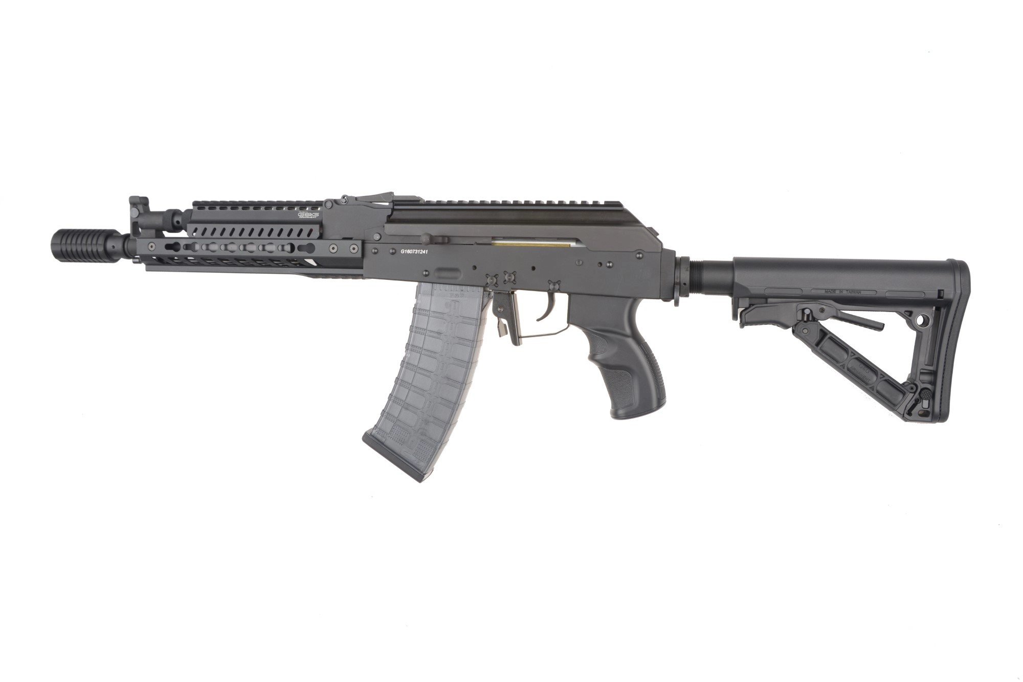 Dwustronna dźwignia przeładowania posiada możliwość blokady w tylnym położeniu dzięki czemu uzyskujemy łatwiejszy dostęp do regulacji systemu Hop-Up. Dźwignia zwalniacza magazynka została zaprojektowana w taki sposób, by można było wypiąć magazynek również palcem wskazującym. Wyjątkowo ergonomiczna kolba posiada 6 stopniową regulację, gumowaną stopkę oraz schowek np. na baterię CR123a. Replika, w przeciwieństwie do starszych wersji, jest kompatybilna ze standardowymi magazynkami do AK dzięki czemu nie musimy się martwić o ich dostępność. Selektor ognia skonstruowano tak by można go było obsługiwać kciukiem.