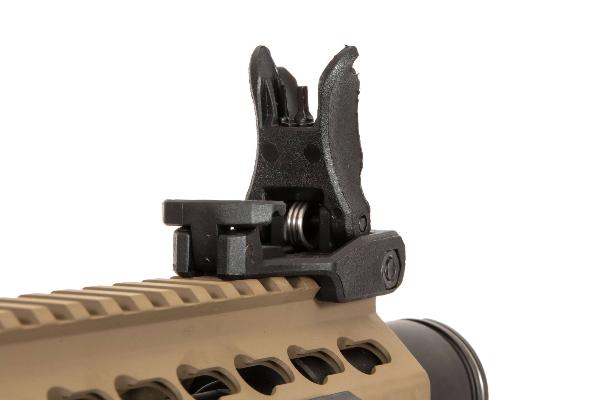 Replika karabinka SA-E07 wyposażona jest we front typu Free Float w standardzie KeyMod pozwalający na montaż różnej maści akcesoriów – chwytów, latarek, wskaźników laserowych czy celowników optycznych. Lufa repliki zakończona jest urządzeniem wylotowym osadzonym na gwincie 14mm CCW. Na grzbietowej szynie RIS umieszczono składane przyrządy celownicze