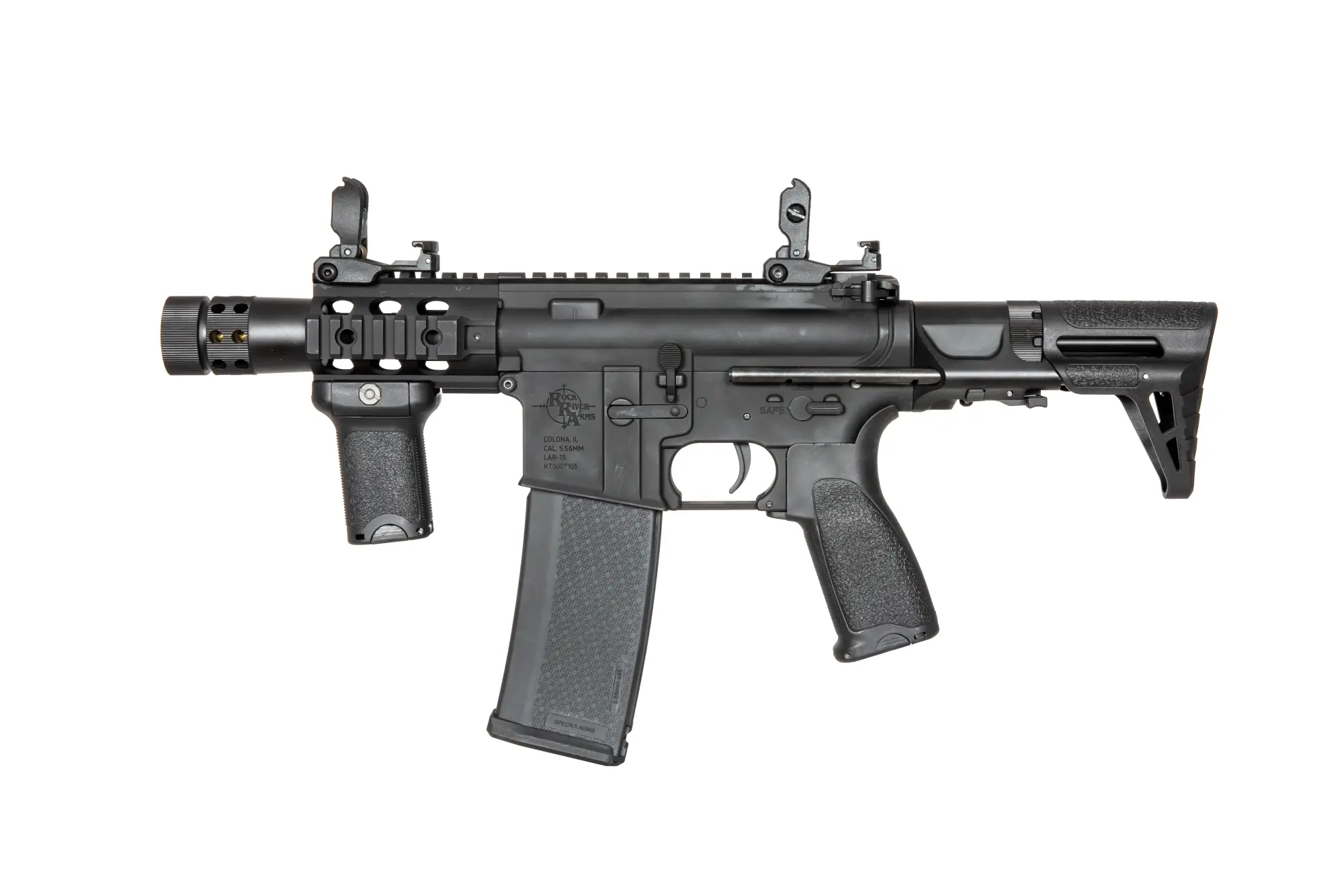 Replika posiada pełne, licencjonowane oznaczenia producenta broni palnej – Rock River Arms. To amerykański producent części i akcesoriów do broni, ale przede wszystkim wysokiej jakości karabinków z rodziny AR-15. Firma założona w 1996 przez braci Larson, do spółki z Lesem Baer’em ma swoją siedzibę w Colonie w stanie Illinois. Dziś RRA dostarcza swoje karabinki na kontrakt między innymi dla agencji anty-narkotykowej DEA, FBI czy US Marshals.