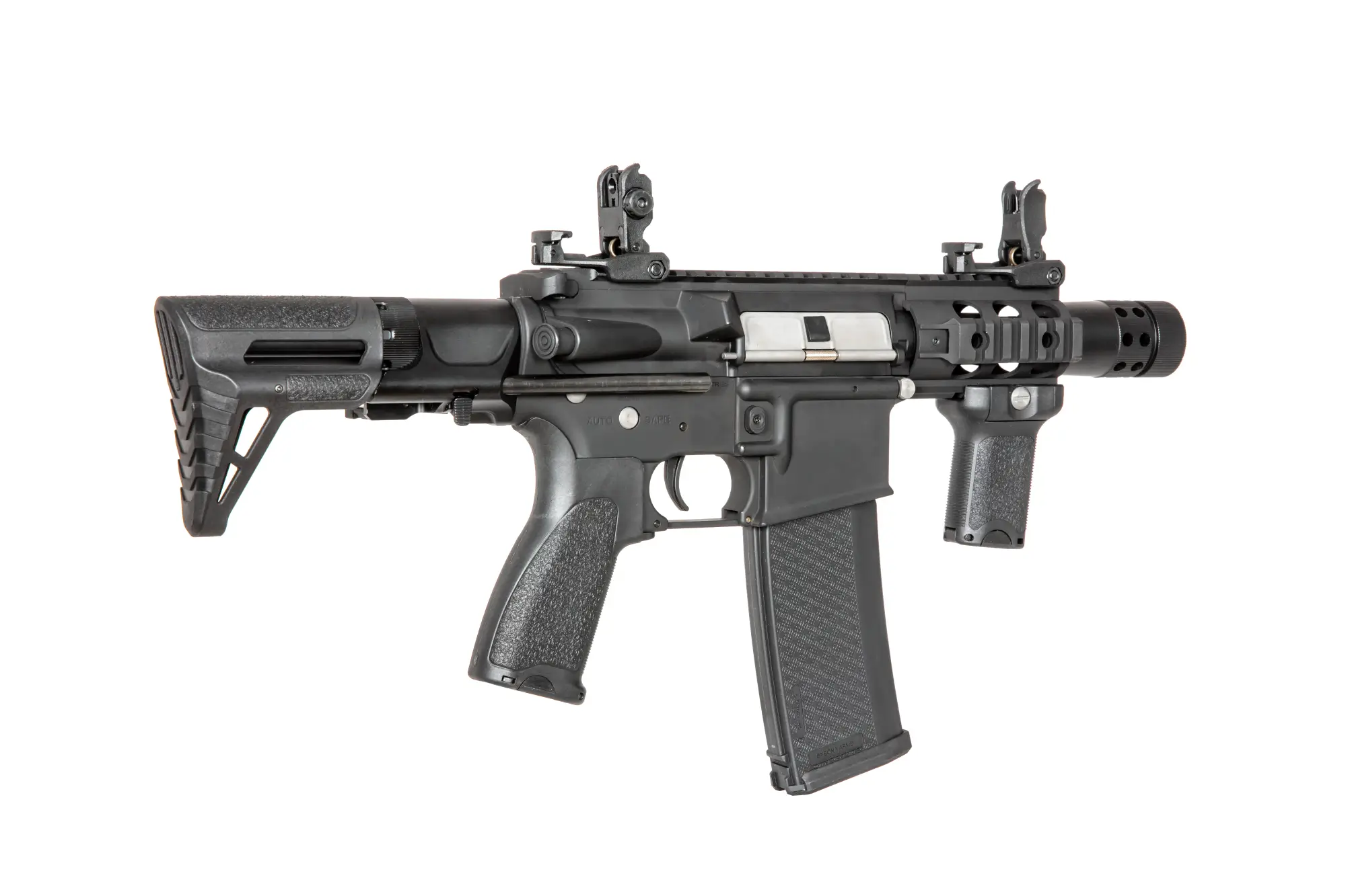 Replika karabinka SA-E10 PDW wyposażona jest w krótki front w standardzie RIS 22mm pozwalający na montaż różnej maści akcesoriów – chwytów, latarek, wskaźników laserowych czy celowników optycznych. Lufa repliki zakończona jest urządzeniem wylotowym osadzonym na gwincie 14mm CCW. Na grzbietowej szynie RIS umieszczono składane przyrządy celownicze