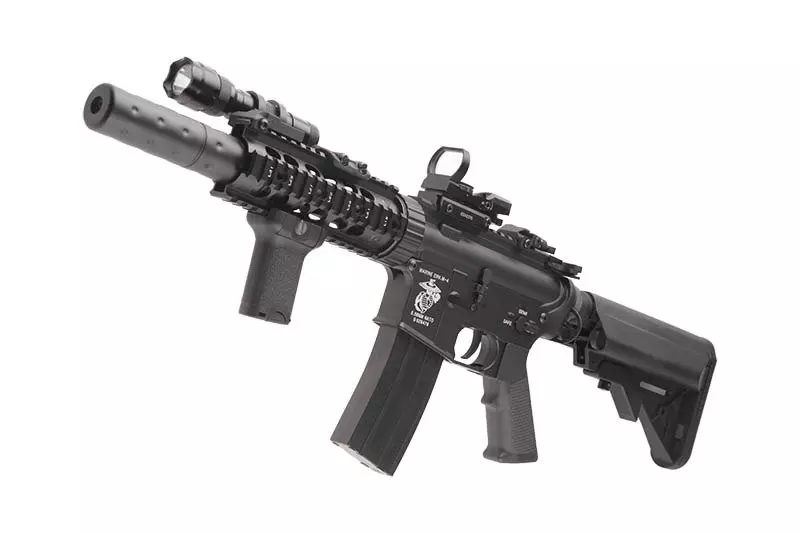 Replika karabinka SA-A07 marki Specna Arms wykonana została w przeważającej części z jednolitego stopu cynku i aluminium, z zastosowaniem elementów stalowych w najbardziej newralgicznych punktach repliki (stalowe są wiec wszystkie śruby, piny oraz uchwyt zawieszenia taktycznego). Mieszczącą akumulator kolbę typu SF jak i chwyt pistoletowy wytworzono z polimerowego tworzywa sztucznego. Korpus repliki oraz zespół szyn RIS poddane zostały procesowi anodyzacji, co gwarantuje wysoki stopień ochrony repliki przed korozją. Samo malowanie repliki wykonane zostało procesem proszkowania, po uprzednim poddaniu powierzchni piaskowaniu. Taka metoda nakładania farby znana jest m.in. z replik G&P i zapewnia znacznie wyższą niż zazwyczaj odporność naniesionej farby na ścieranie. Na korpusie naniesione zostały oznaczenia USMC.