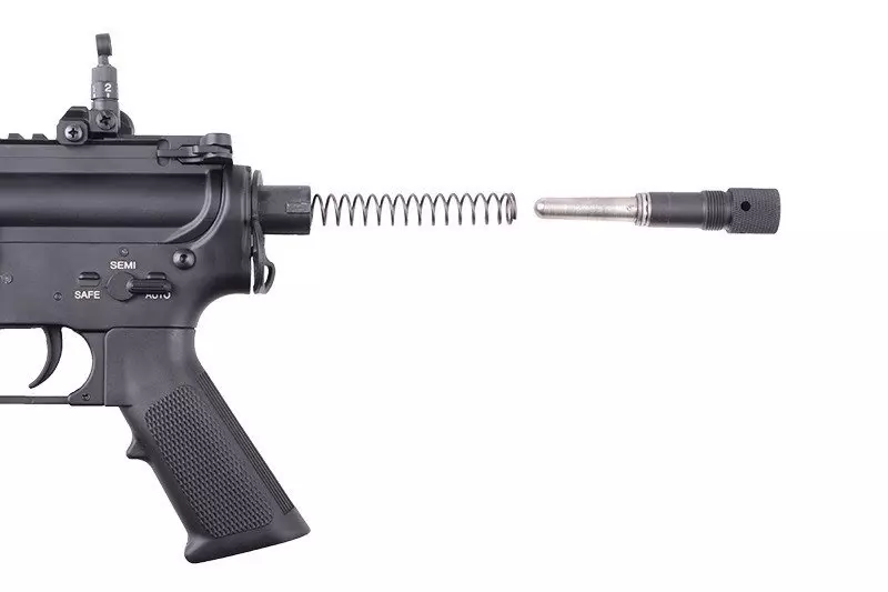 Dzięki SAEC™ System nie ma potrzeby wyciągania gearboxa z repliki – wystarczy zdjąć prowadnicę kolby (bez użycia narzędzi – mocowana jest przy pomocy nakręcanego pierścienia oaz zatrzasku), a następnie wykręcić znajdujący się pod nią specjalny trzpień wraz z łożyskowaną prowadnicą sprężyny. Wymieniamy sprężyne główną, wkręcamy trzpień z powrotem do korpusu, mocujemy kolbę, po czym… wracamy do gry! Cała operacja trwa dosłownie chwilę, oraz co powtórzmy: nie wymaga żadnych narzędzi.