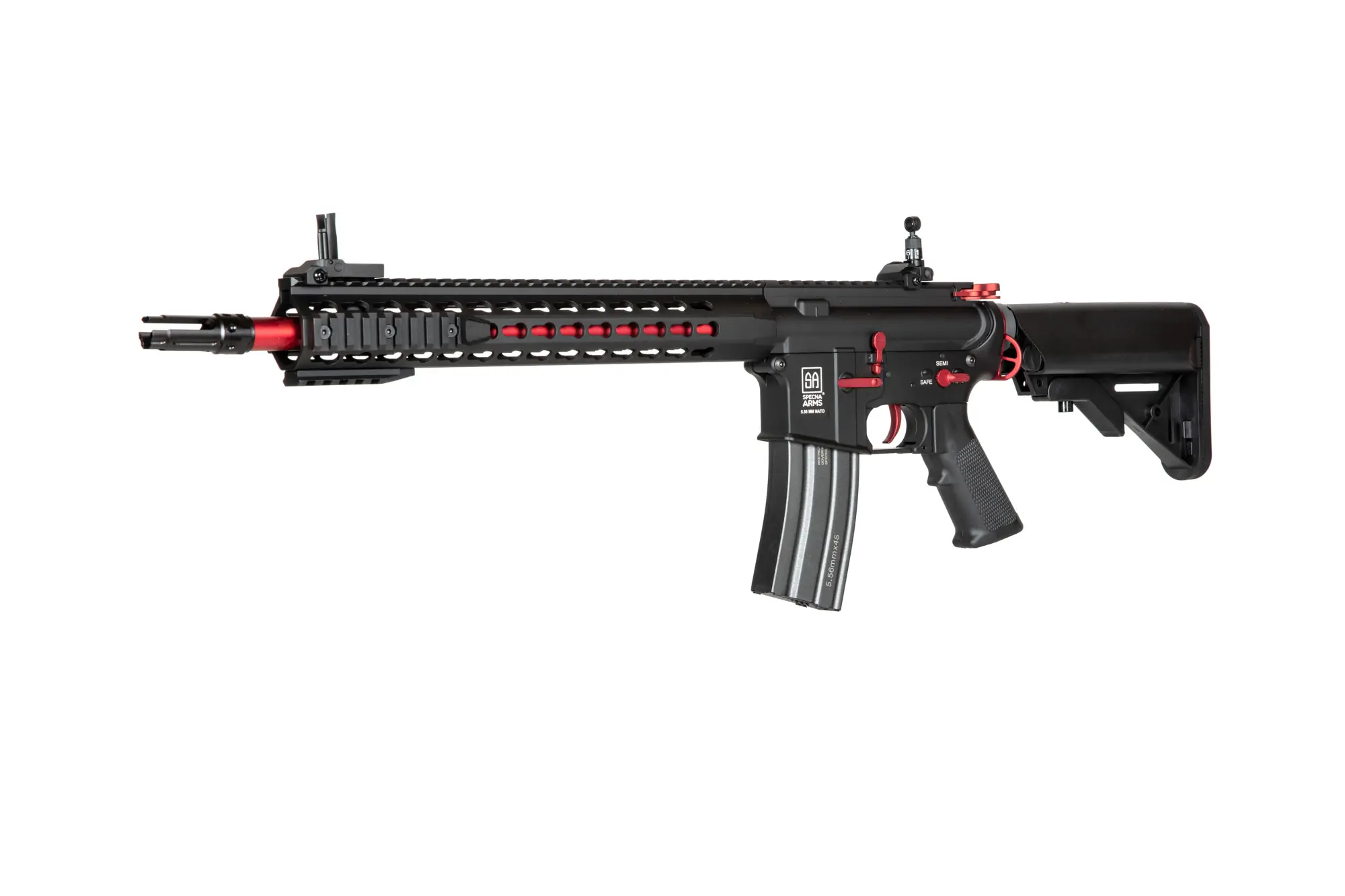 Replika karabinka SA-B14 marki Specna Arms wykonana została w przeważającej części z jednolitego stopu cynku i aluminium, z zastosowaniem elementów stalowych w najbardziej newralgicznych punktach repliki (stalowe są wiec wszystkie śruby, piny oraz uchwyt zawieszenia taktycznego). Mieszczącą akumulator kolbę typu SF jak i chwyt pistoletowy wytworzono z polimerowego tworzywa sztucznego. Korpus repliki poddany został procesowi anodyzacji, co gwarantuje wysoki stopień ochrony repliki przed korozją. Samo malowanie repliki wykonane zostało procesem proszkowania, po uprzednim poddaniu powierzchni piaskowaniu. Taka metoda nakładania farby zapewnia znacznie wyższą niż zazwyczaj odporność naniesionej farby na ścieranie. Na korpusie naniesione zostały oznaczenia USMC.