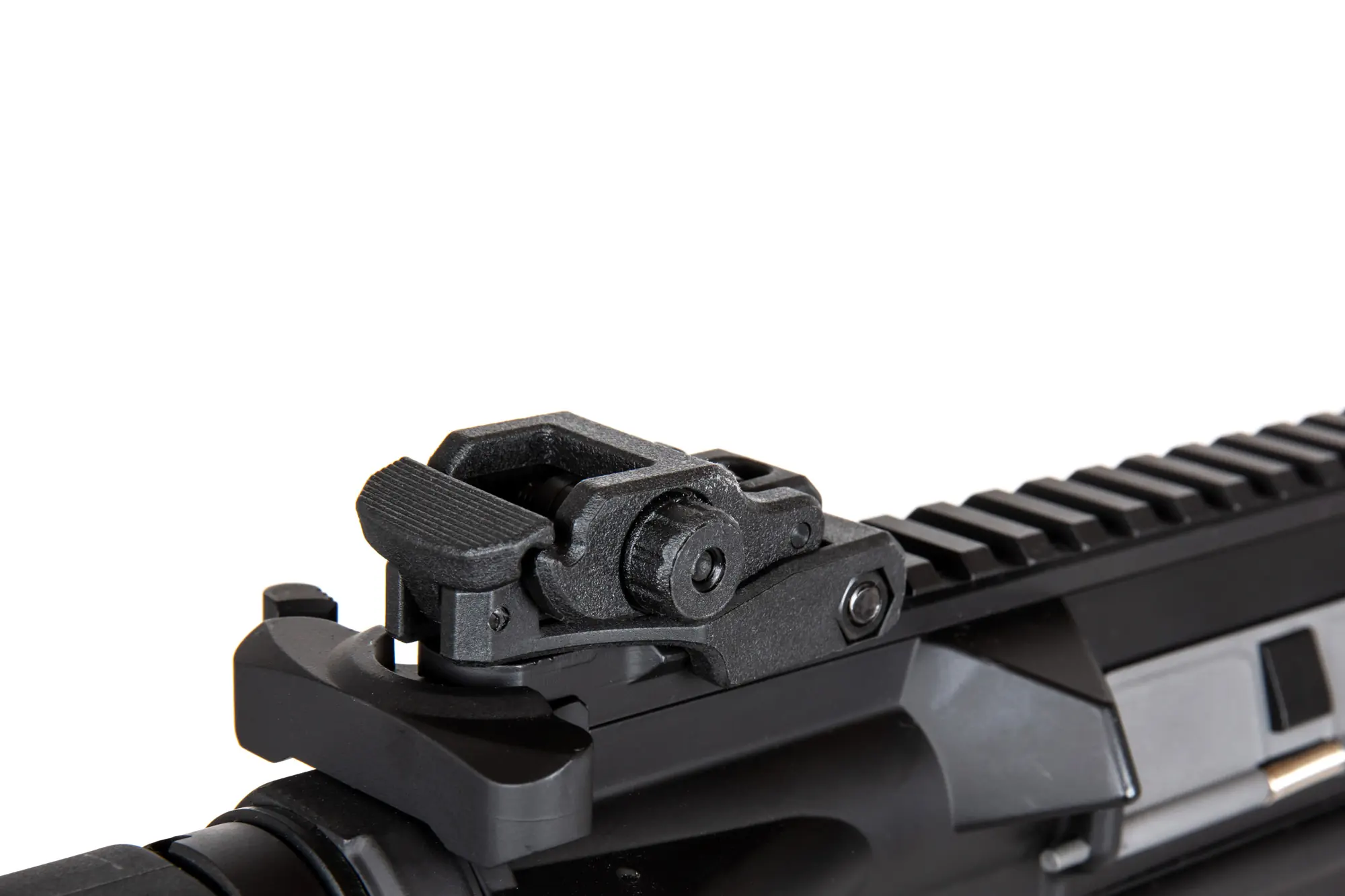 Replika karabinka SA-E06-H wyposażona jest we frontową szynę free-float w systemie montażowym RIS 22mm. Prócz długiej, grzbietowej szyny RIS na której umieszczono składane przyrządy celownicze replika posiada krótką szynę pod lufą oraz po bokach szyny.