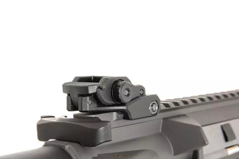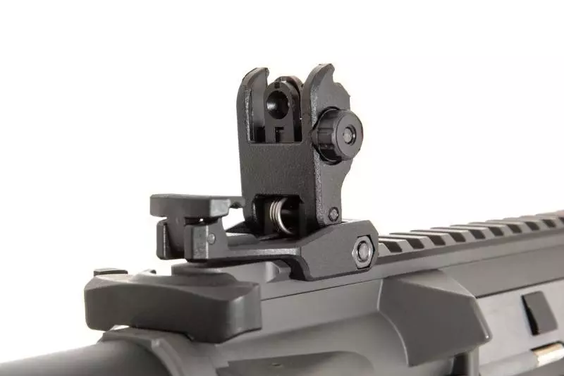 Replika karabinka SA-E12 PDW wyposażona jest we front free-float w systemie montażowym RIS 22mm na którym montować można różnej maści akcesoria taktyczne: latarki, chwyty, wskaźniki laserowe czy celowniki optyczne. Na grzbiecie repliki umieszczono także składane przyrządy celownicze.