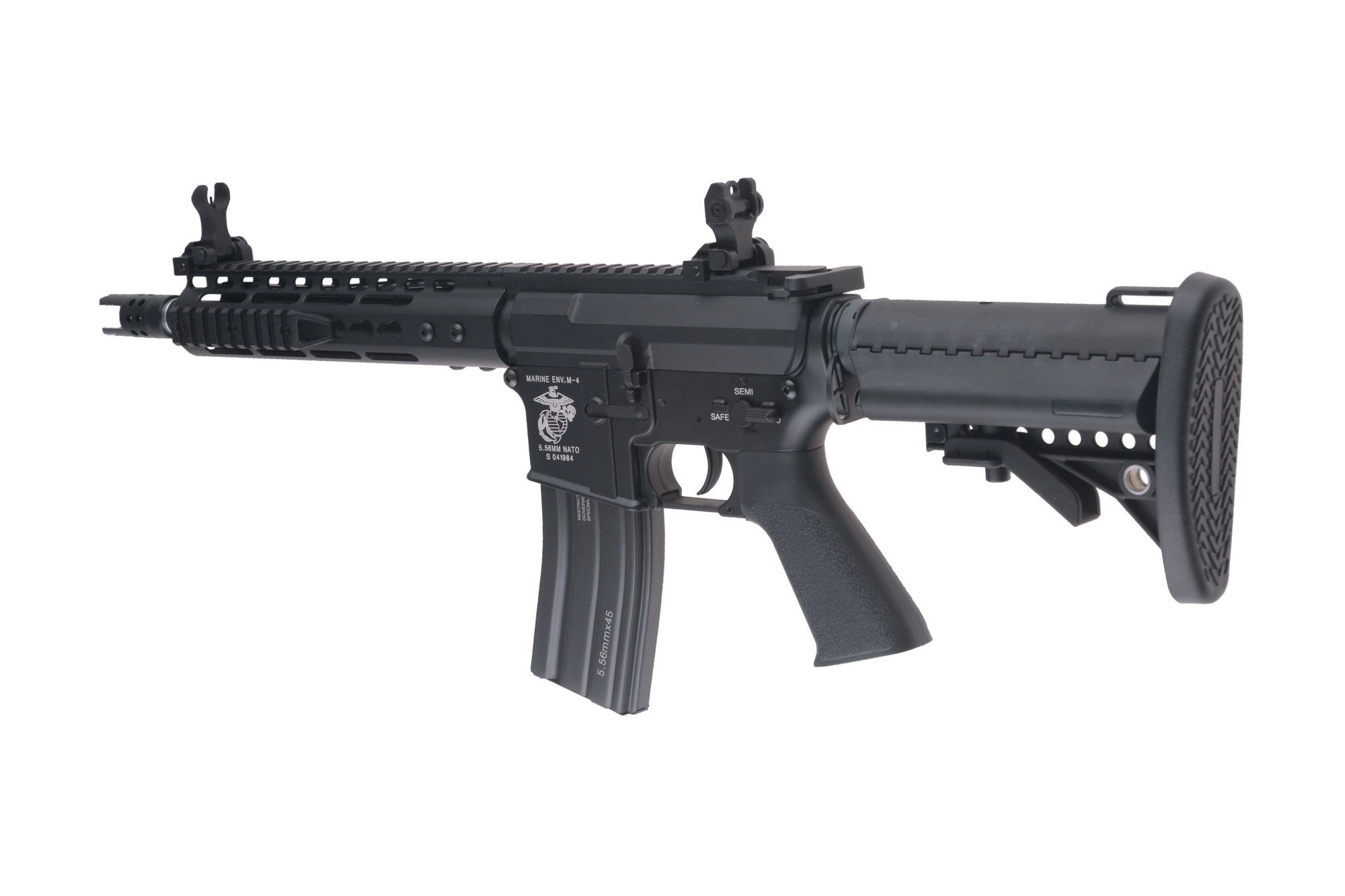 Replika karabinka SA-V04 marki Specna Arms wykonana została w przeważającej części z jednolitego stopu cynku i aluminium, z zastosowaniem elementów stalowych w najbardziej newralgicznych punktach repliki (stalowe są wiec wszystkie śruby, piny oraz uchwyt zawieszenia taktycznego). Mieszczącą akumulator kolbę typu SF jak i chwyt pistoletowy wytworzono z polimerowego tworzywa sztucznego. Korpus repliki poddany został procesowi anodyzacji, co gwarantuje wysoki stopień ochrony repliki przed korozją. Samo malowanie repliki wykonane zostało procesem proszkowania, po uprzednim poddaniu powierzchni piaskowaniu. Taka metoda nakładania farby zapewnia znacznie wyższą niż zazwyczaj odporność naniesionej farby na ścieranie. Na korpusie naniesione zostały oznaczenia USMC.