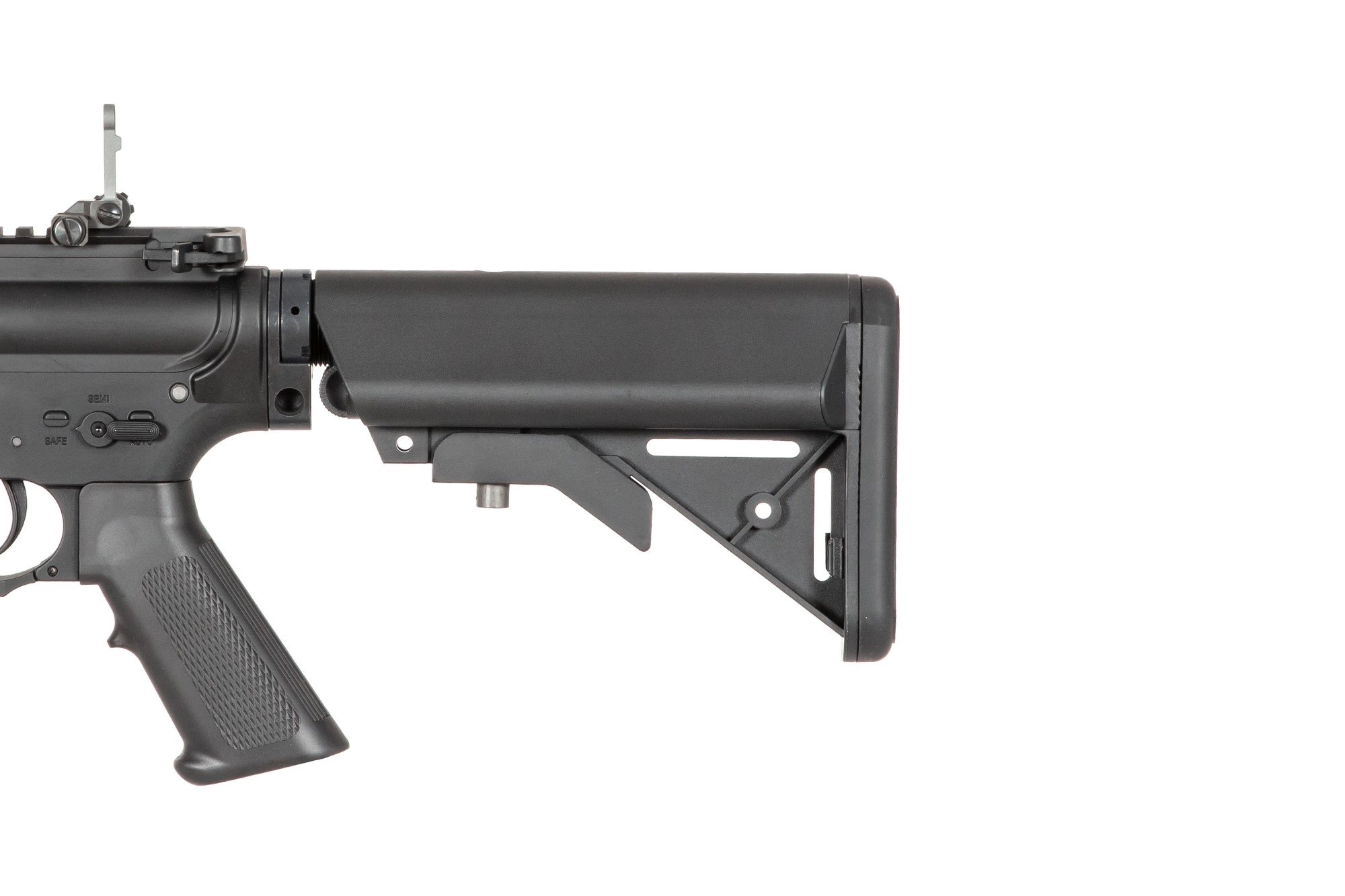 Replika została wykonana w większości z wysokiej jakości stopu aluminium – cały korpus, lufa zewnętrzna, prowadnica kolby, etc. Z mocnego tworzywa wytworzono jedynie kolbę oraz chwyt pistoletowy. Jest to teleskopowa kolba typu SF, 5-pozycyjna – można wyregulować jej długość, by dostosować replikę do budowy i preferencji strzelca, miejsce na baterię znajduje się wewnątrz prowadnicy kolby.