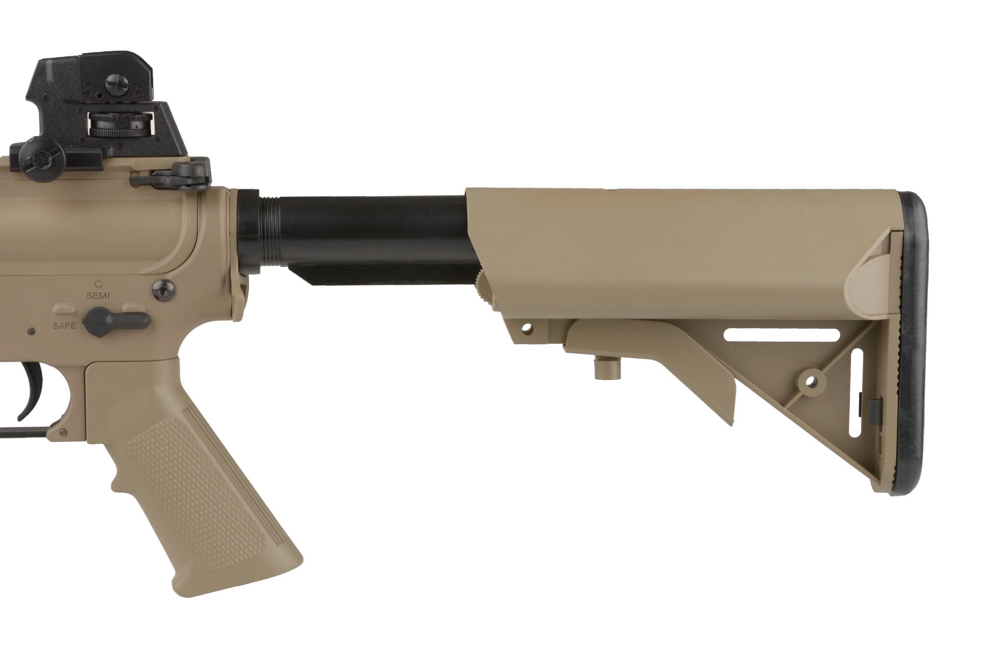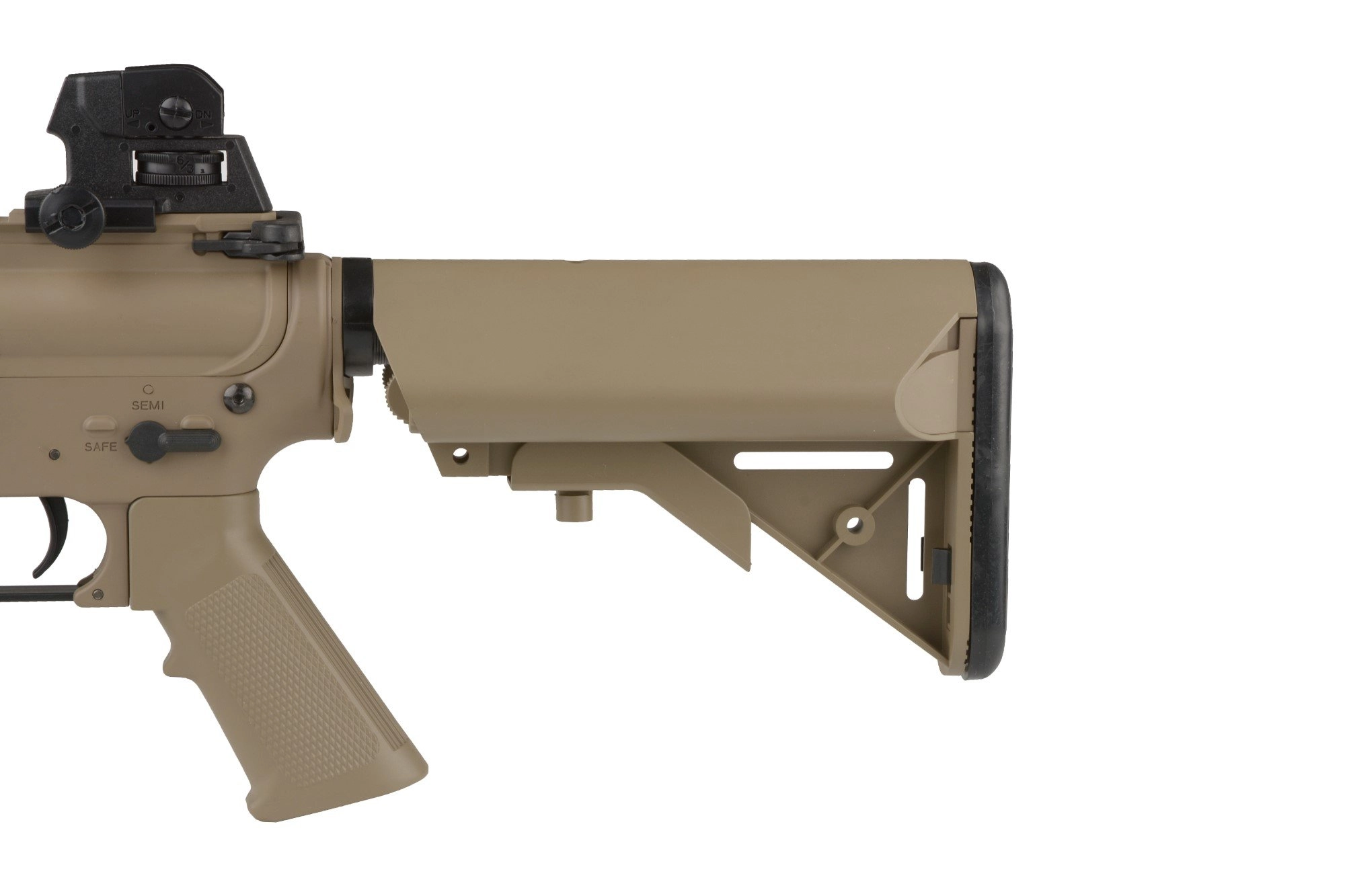 Dostęp do suwaka regulacji systemu hop-up uzyskujemy standardowo, po odciągnięciu rączki przeładowania. Z lewej strony korpusu znajduje się selektor trybu ognia/bezpiecznik. Sercem repliki jest solidny, w pełni metalowy gearbox typu v.2, wyposażony w komplet stalowych kół zębatych, łożyskowaną prowadnicę sprężyny i 7mm łożyska, dzięki któremu replika osiąga prędkość wylotową rzędu ~410 FPS prosto z pudełka.