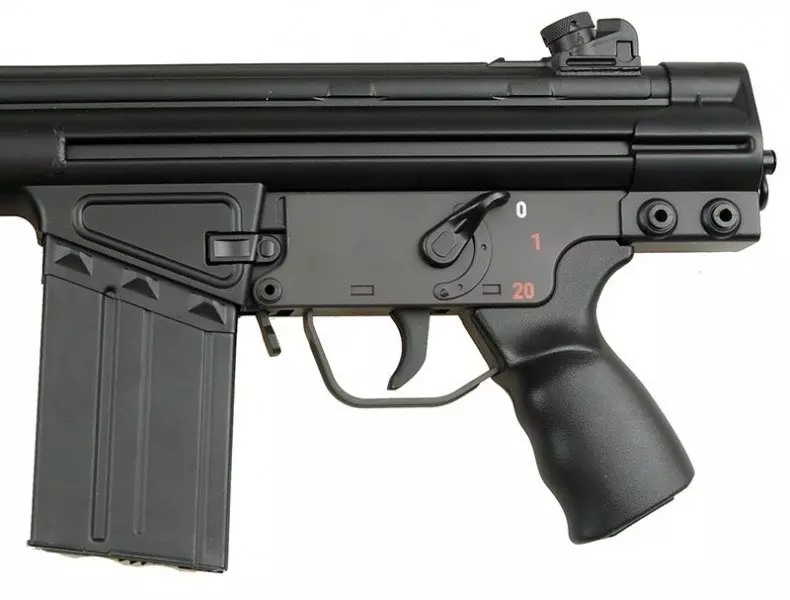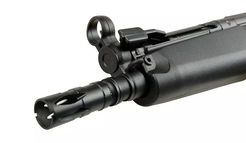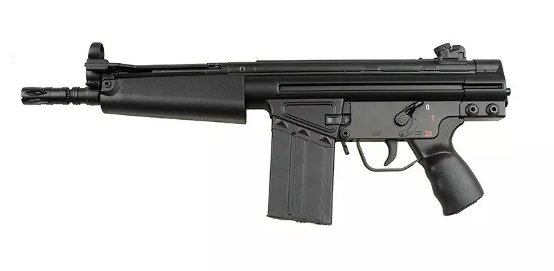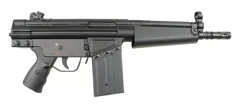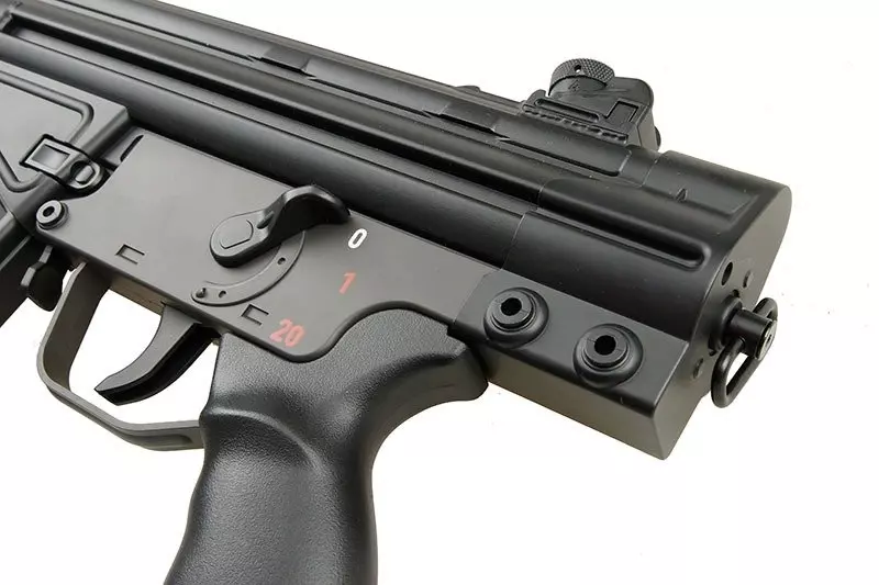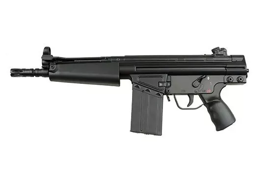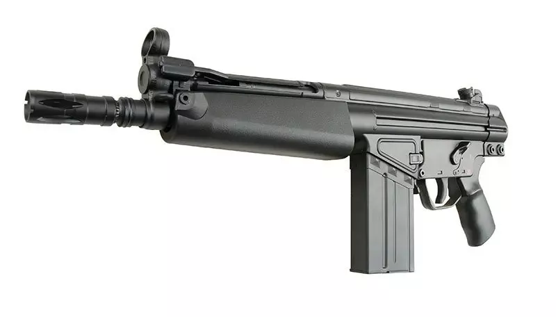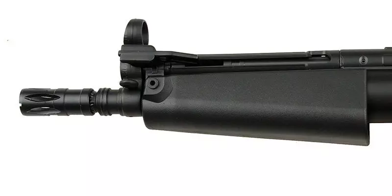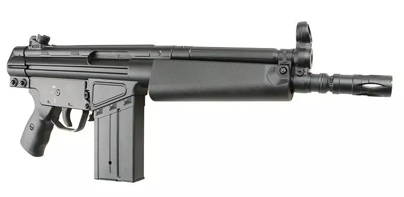 Bardzo poręczna replika, idealnie nadająca się do rozgrywek CQB. Replika wykonana jest z metalu oraz tworzywa. Korpus, chwyt przedni, chwyt pistoletowy wykonano z wytrzymałego tworzywa, natomiast tłumik płomienia i magazynek z metalu.