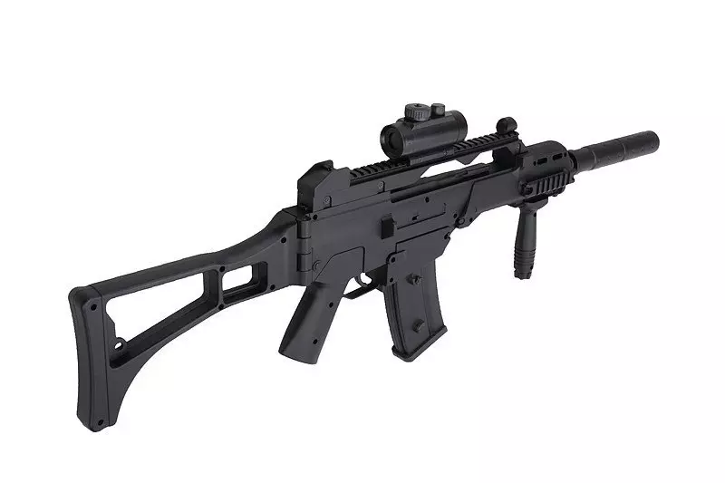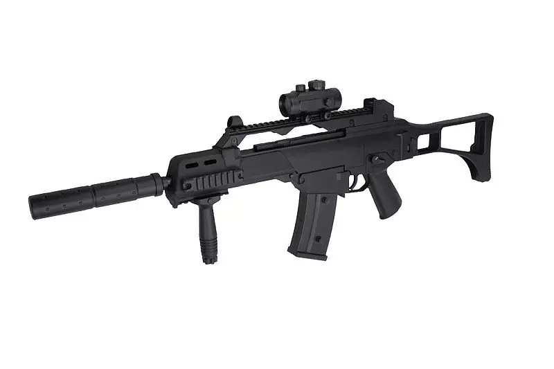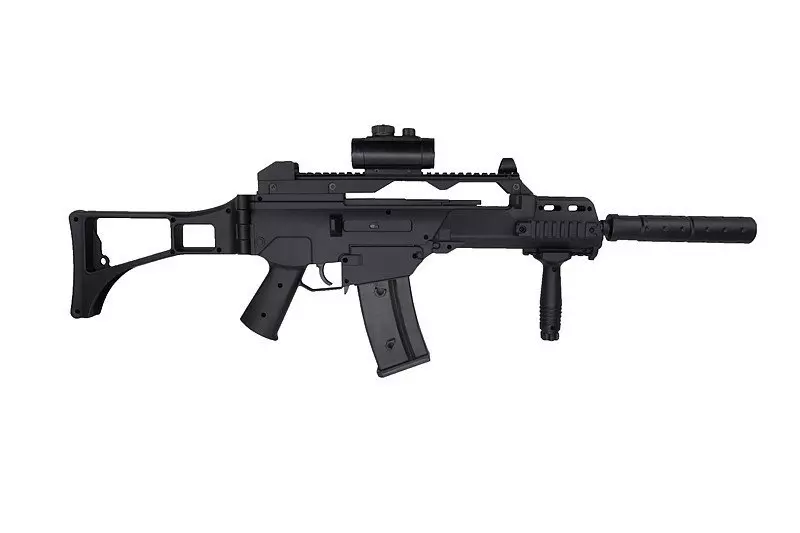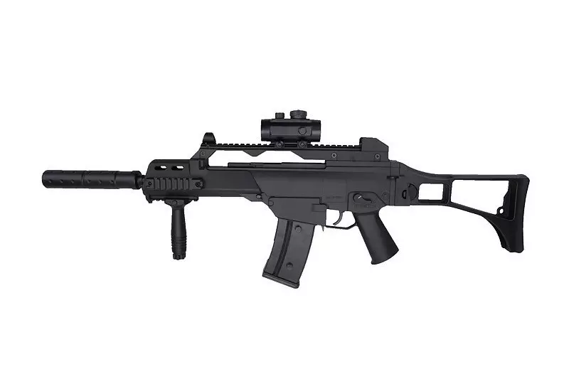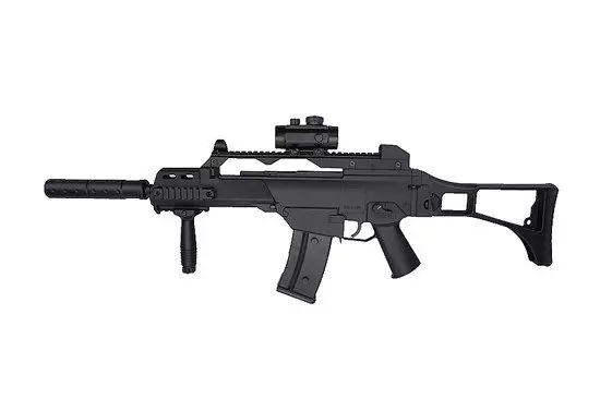 W zestawie z repliką znajdują się akcesoria takie jak celownik kolimatorowy czy rączka taktyczna – montowane na szynę RIS 22 mm. Do repliki dołączony został także pas nośny oraz akumulator z ładowarką i okulary ochronne.
