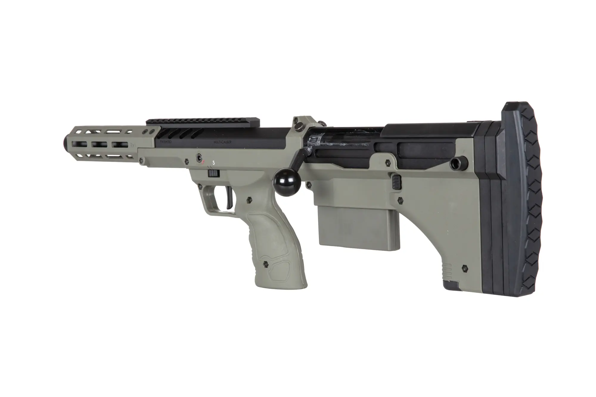SRS-A2/M2 to nowa seria znakomitych replik o napędzie sprężynowym produkcji Silverback, wyprodukowanych na licencji amerykańskiej firmy Desert Tech®. SRS (Scout Recon Stealth) to kompaktowe karabiny snajperskie w układzie bullpup. W lekkim wariancie “Sport” korpus wraz z chwytem pistoletowym, magazynek i łoże wykonano z polimerowego tworzywa sztucznego. Pozostałe elementy takie jak komora zamkowa, lufa zewnętrzna, czy urządzenie wylotowe są aluminiowe, natomiast rączkę przeładowania i zatrzask magazynka wykonano ze stali. Seria A2 to poprawiona wersja, która charakteryzuje się jeszcze lepszym wykonaniem, ergonomią i jeszcze lepszymi osiągami w stocku.