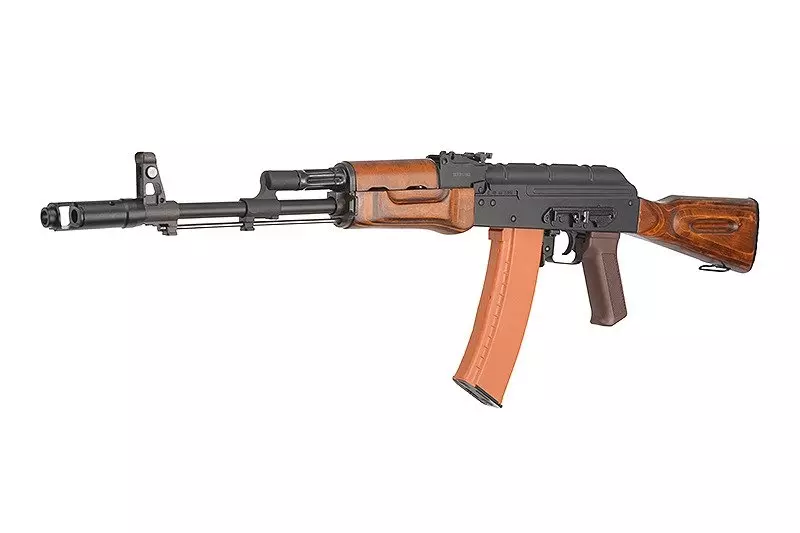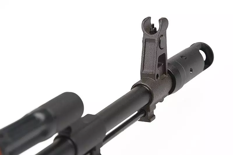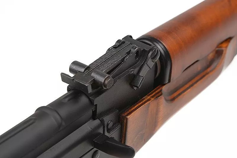 Wewnętrznie replika prezentuje się naprawdę profesjonalnie. Znajdziemy w niej niskooporowe przewody doposażone w układ MOSFET w celu najwyższej oszczędności energetycznej i dodatkowego uodpornienia wszystkich układów czułych na związane z prądem przeciążenia i temperaturę. Dostęp do dźwigni regulacji systemu Hop-Up uzyskujemy klasycznie – po odciągnięciu rączki przeładowania. Z prawej strony korpusu znajduje się skrzydełkowy selektor trybu ognia wraz z bezpiecznikiem. Z lewej natomiast, znalazł się montaż pod szynę typu jaskółczy ogon.