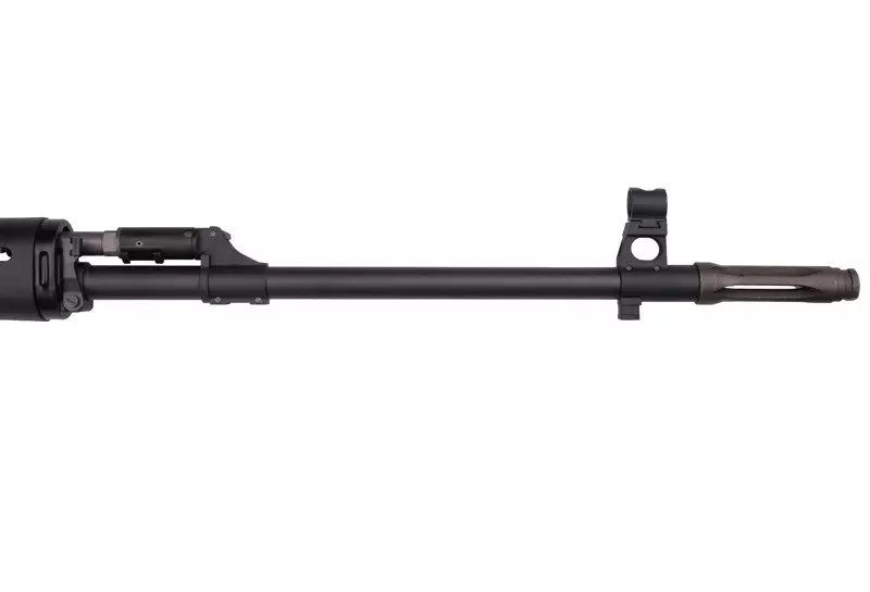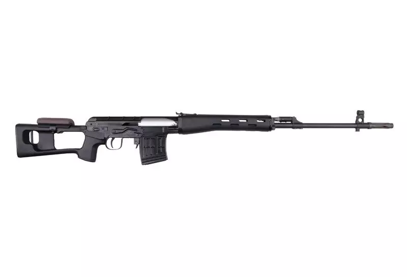 Długo wyczekiwana, wysokiej jakości replika karabinu wyborowego wykonana przez firmę WE. Do produkcji repliki wykorzystano wzbogacone aluminium, tworzywo polimerowe oraz stal. Z aluminium wykonano lufę zewnętrzną wraz z podstawą muszki i reduktorem podrzutu, szczerbinkę oraz główny korpus, ze stali zaś klapę, magazynek oraz większość drobnych elementów (w tym przełącznik trybu ognia), jak również stopkę kolby i kosz spustowy. Sama kolba wykonana została, podobnie jak łoże przednie, z polimerowego tworzywa sztucznego – wzorem późniejszych modeli karabinu. Dodatkowo zaopatrzona jest w wygodną, gumową poduszkę policzkową, tzw. bakę.