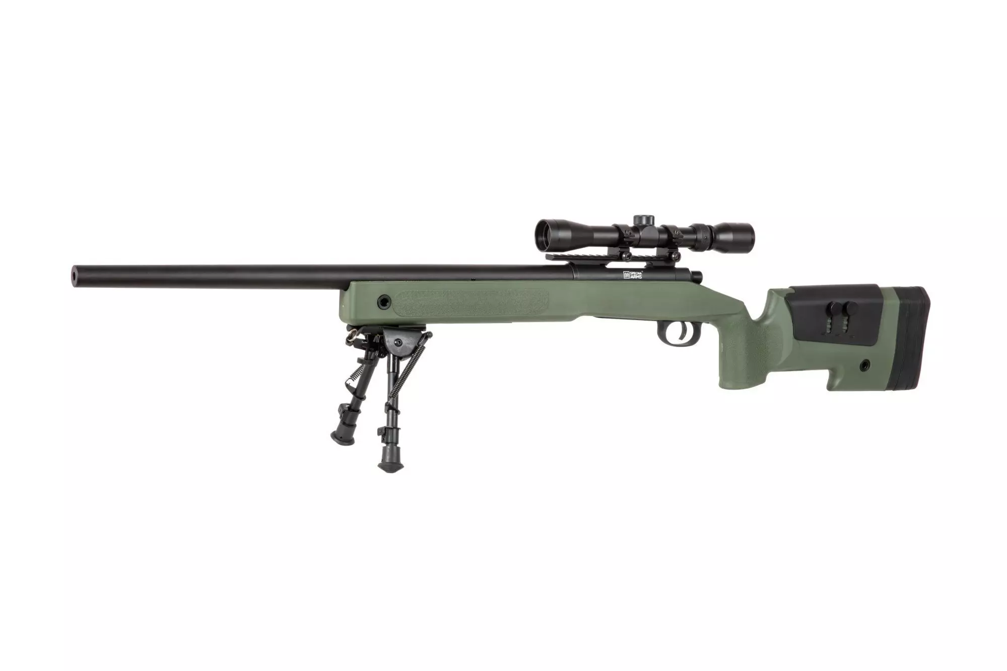Replikę snajperską Specna Arms wyposażono w prosty i niezawodny system czterotaktowy, który należy przeładować przed oddaniem każdego strzału. Replika wykonana została z metalu oraz wzmocnionego tworzywa sztucznego. Metalowy jest tu cały zespół lufy zewnętrznej wraz z komorą zamkową, spustem i rączką przeładowania, a także szyny akcesoryjne RIS / Picatinny i wszystkie elementy montażowe, takie jak śruby. Łoże z kolbą, bakę policzkową, stopkę kolby i magazynek wykonano z solidnego tworzywa sztucznego. Sama stopka kolby zakończona została wygodną, gumową nakładką, jej grubość można regulować dzięki kompletowi wymiennych nakładek. W połączeniu z regulowaną baką policzkową daje to możliwość dopasowania kolby do preferencji strzelca.