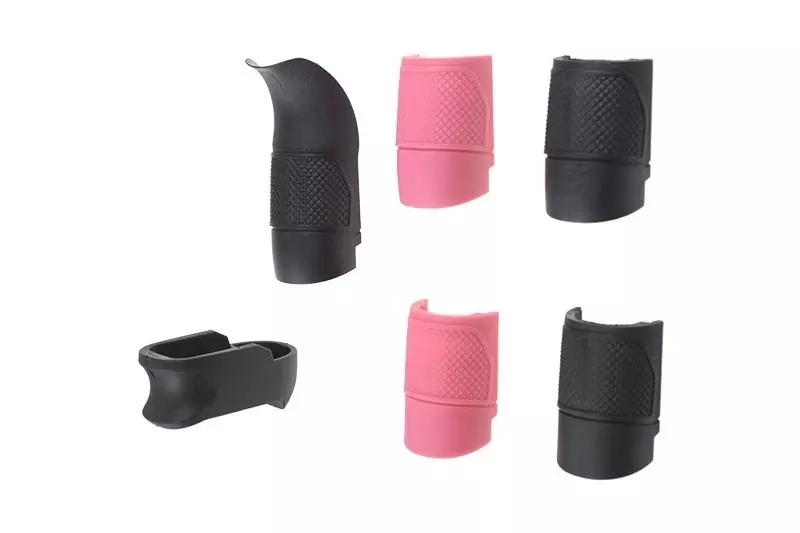 W zestawie znajdują się dwa komplety okładzin chwytu pistoletowego. Jeden z kompletów wykonany jest w kolorze czarnym, drugi zaś w kolorze różowym umożliwiającym identyfikację repliki jako broni treningowej.