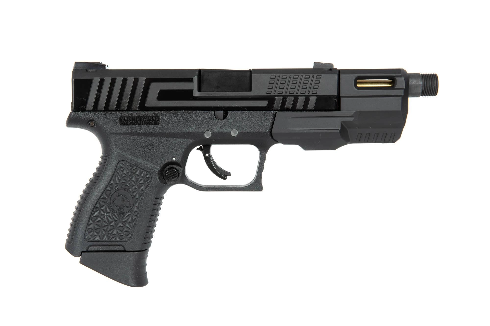 XMK to pistolet produkcji ICS należący do serii replik gazowych BLE – Black Leopard Eye. Ten nowocześnie zaprojektowany pistolet posiada zamek wykonany z aluminium oraz szkielet z tworzywa z włóknem nylonowym. Replika zasilana jest green gazem, posiada kompensator kryjący przedłużoną lufę wewnętrzną. Dzięki dołączonemu adapterowi na 14mm CCW mamy możliwość wyposażenia pistoletu w tłumik dźwięku.
