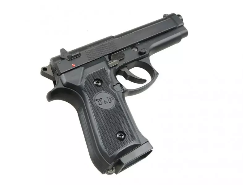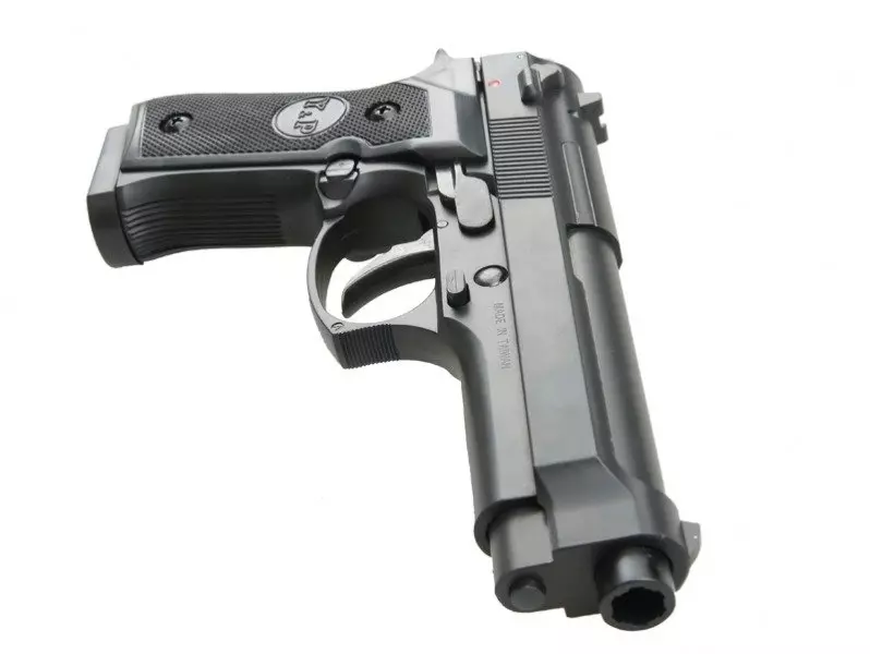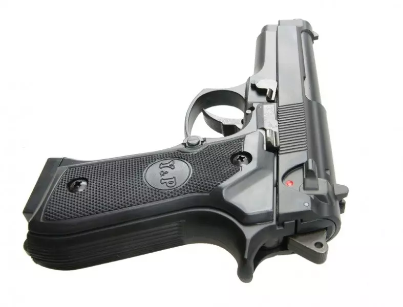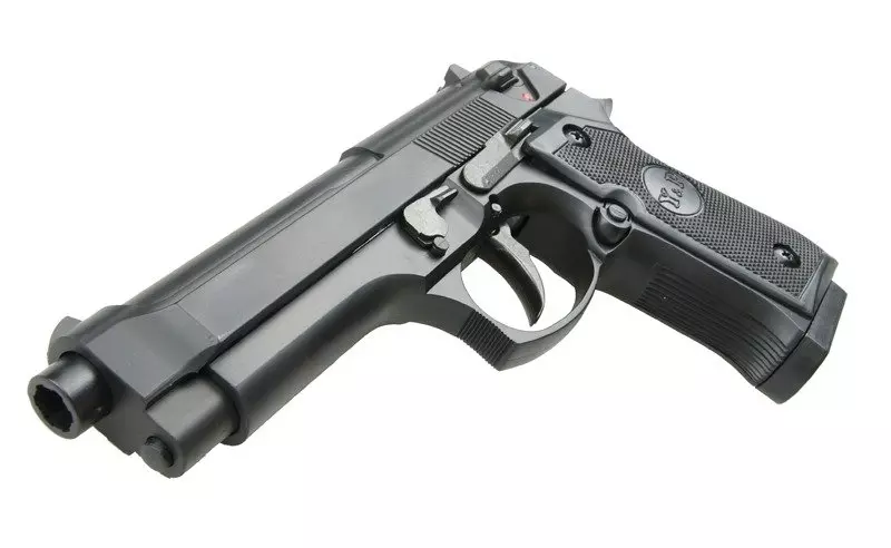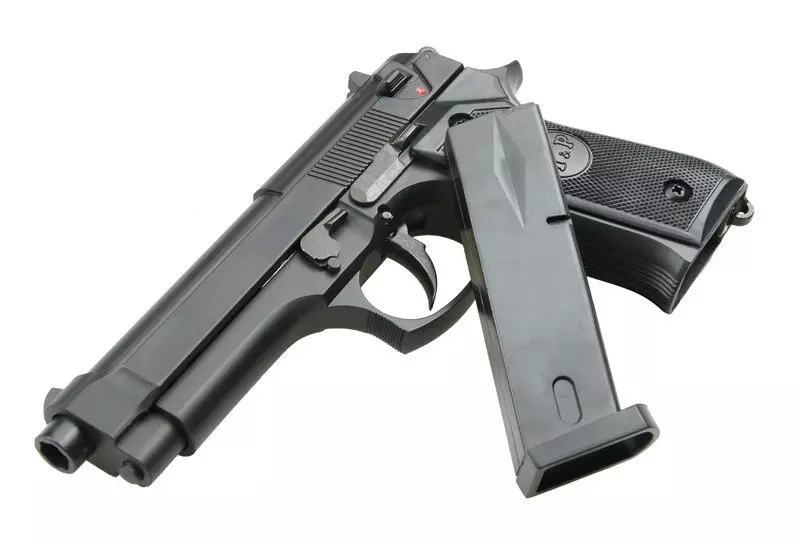 Sprężynowa replika pistoletu GAH9902 wykonana z tworzywa. Po wystrzeleniu ostatniej kulki zamek zostaje zatrzymany podczas przeładowania w pozycji “otwartej”. Bezpiecznik znajduje się po prawej stronie łoża przed spustem.