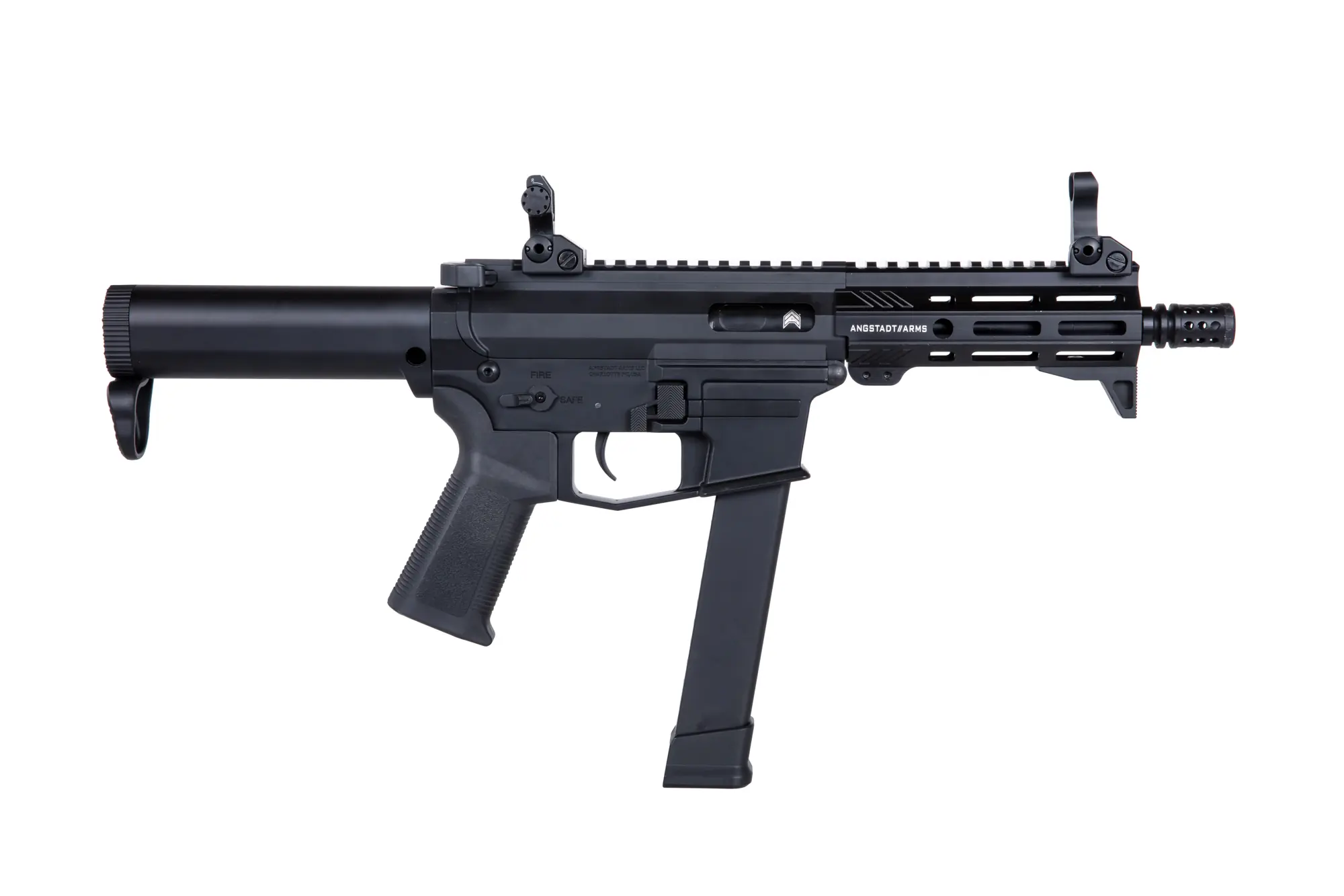 – Licencjonowane oznaczenia Angstadt Arms na froncie, korpusie oraz atrapie suwadła,