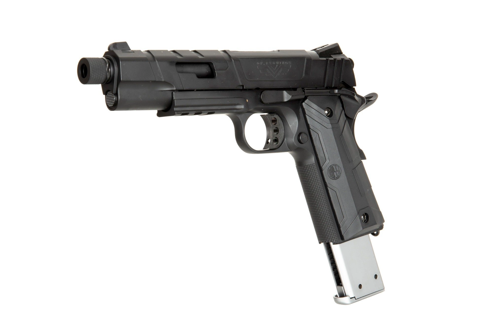 Replika pistoletu RedWings wykonano prawie w całości z metalu. Metalowy jest zamek, szkielet czy lufa repliki. Z lekkiego ale wytrzymałego tworzywa wykonano zaś polimerowe okładziny chwytu pistoletowego.