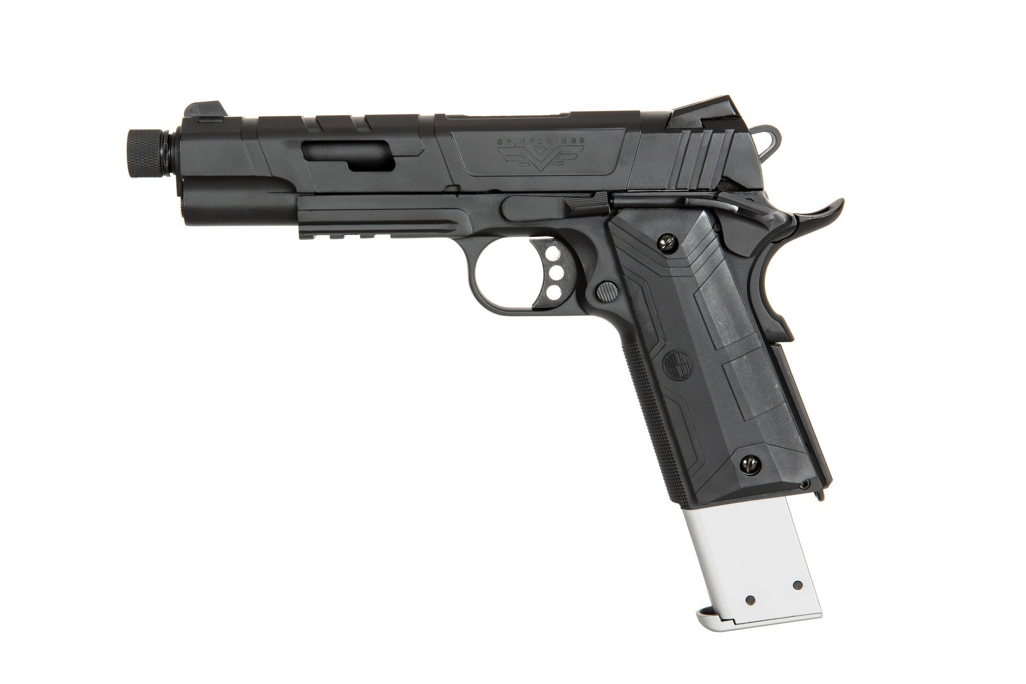 Replikę pistoletu RedWings wykonano z metalu oraz wytrzymałego tworzywa sztucznego. Metalowy jest zamek, szkielet, lufa repliki oraz magazynek mieszczący 35 kulek. Z tworzywa wykonano okładziny chwytu pistoletowego.