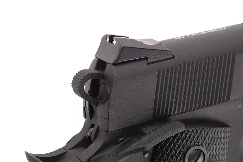 Pistolet posiada mocny system blow-back, który imituje wrażenie strzelania z prawdziwej broni. Podobnie jak w palnym oryginale, po wystrzeleniu ostatniej kulki zamek pistoletu blokuje się w tylnym położeniu. Pod lufą umieszczono szynę RIS / Picatinny 22mm, dzięki której doposażymy replikę w akcesoria dodatkowe takie jak oświetlenie taktyczne, czy celowniki laserowe. Pod nakrętką na lufie zewnętrznej znajdziemy standardowy, lewoskrętny gwint 14mm, kompatybilny ze zdecydowaną większością tłumików airsoftowych dostępnych na rynku.