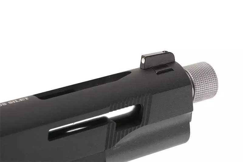 Pistolet posiada mocny system blow-back, który imituje wrażenie strzelania z prawdziwej broni. Podobnie jak w palnym oryginale, po wystrzeleniu ostatniej kulki zamek pistoletu blokuje się w tylnym położeniu. Pod lufą umieszczono szynę RIS / Picatinny 22mm, dzięki której doposażymy replikę w akcesoria dodatkowe takie jak oświetlenie taktyczne, czy celowniki laserowe. Pod nakrętką na lufie zewnętrznej znajdziemy standardowy, lewoskrętny gwint 14mm, kompatybilny ze zdecydowaną większością tłumików airsoftowych dostępnych na rynku.