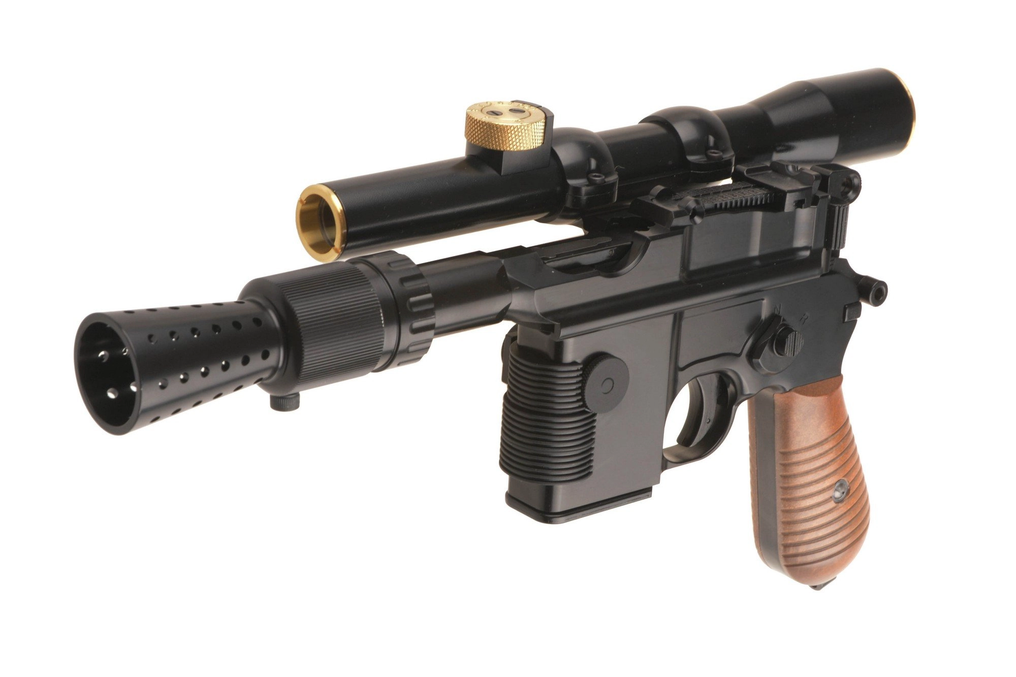 Przedmiotem powyższej dywagacji jest replika blastera należącego do największego przemytnika uniwersum gwiezdnych wojen. Odpowiedzialnym za ten obiekt westchnień wielu fanów serii jest znana i ceniona za oryginalność i jakość wykonania firma Armorer Works. Bazą do stworzenia blastera stała się replika popularnego w ostatnim czasie pistoletu Mauser C96 będąca jednocześnie podstawą do stworzenia oryginalnego pierwowzoru, dla tego poniżej słów kilka o technikaliach tego cuda.