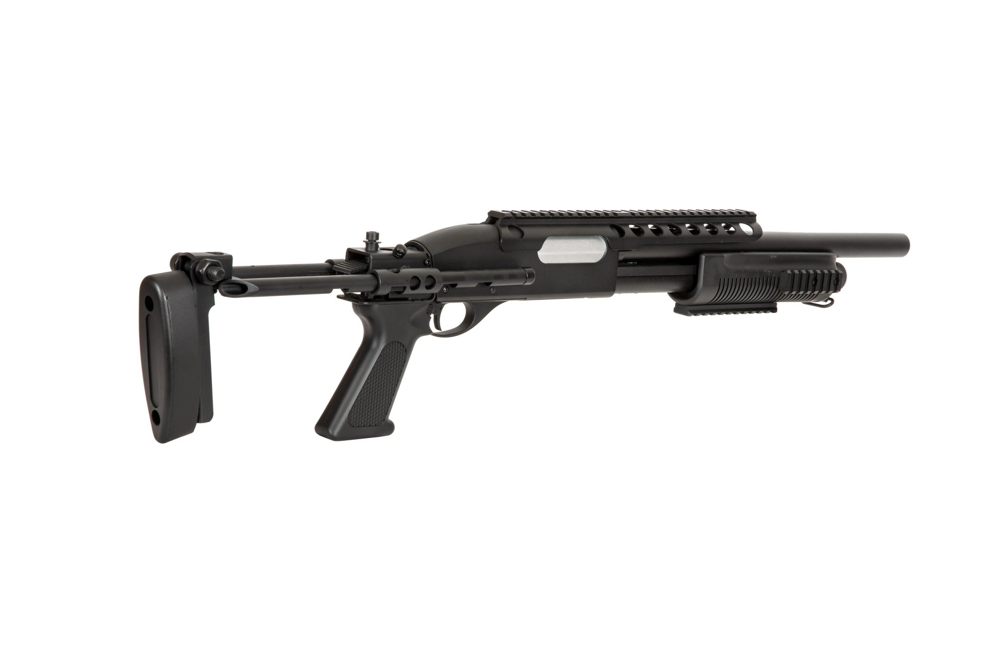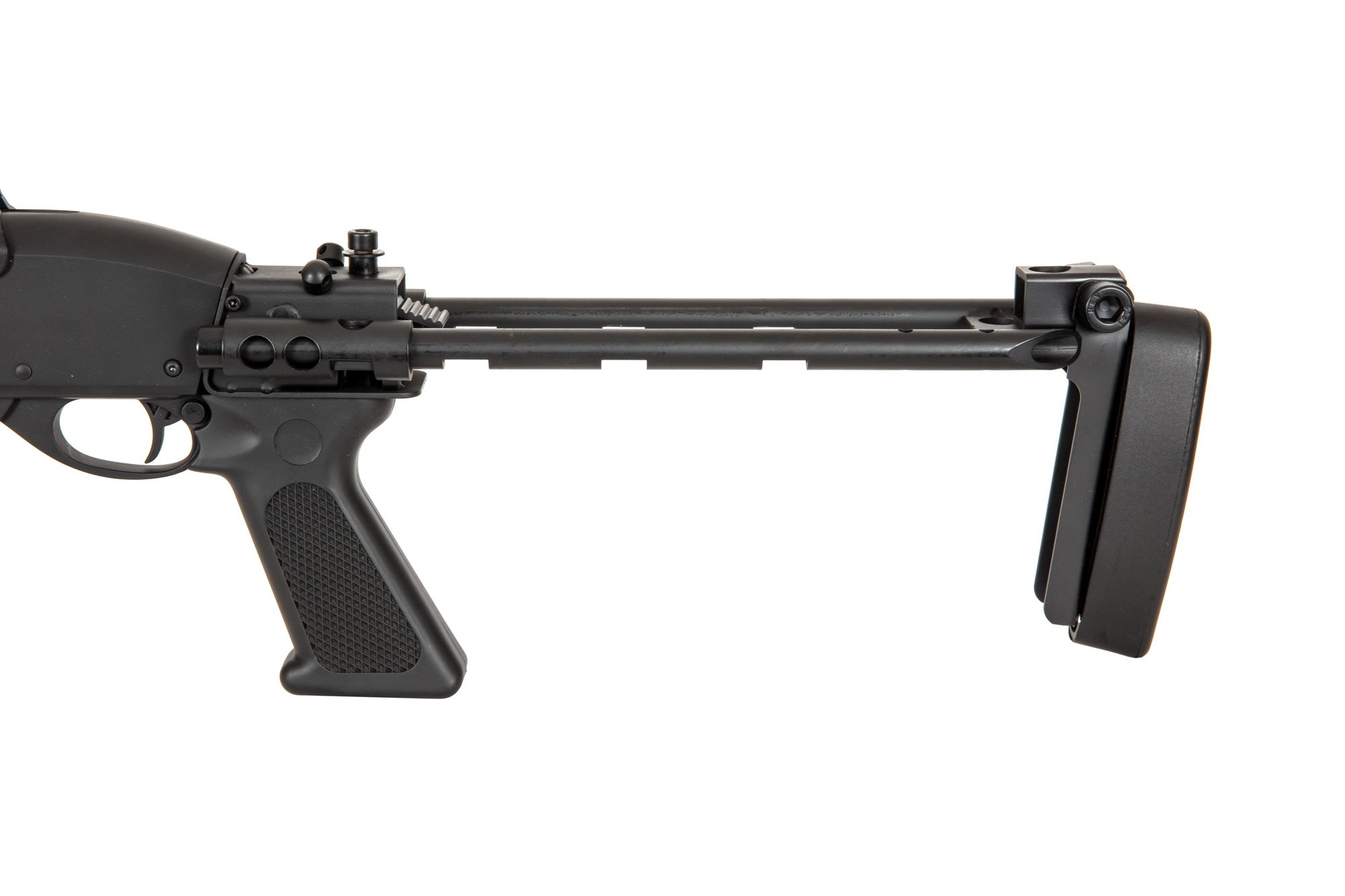 Nieco skrócona lufa oraz składana kolba zapewniają dobrą manewrowość, co czyni z 870 Tactical dobre narzędzie do airsoftowej walki w warunkach CQB, choć sprawdzi się też na średnich dystansach. Blokada spustu znajduje się zaraz obo kabłąka spustowego.
