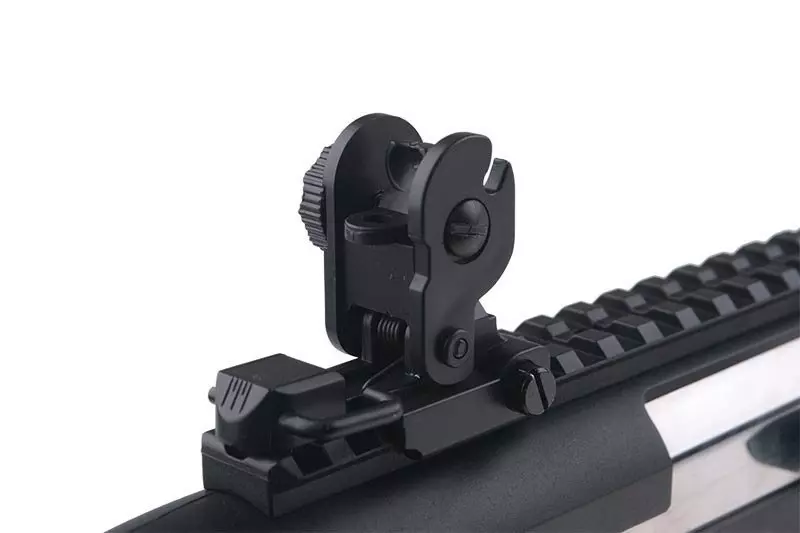 Rękojeść przeładowania wykonana jest w systemie KEYMOD do którego pasują dedykowane akcesoria jak szyny ris, chwyty czy latarki taktyczne. Długa, grzbietowa szyna RIS posiada składane przyrządy celownicze, pozwala także na montaż różnej maści celowników optycznych jak kolimatory.
