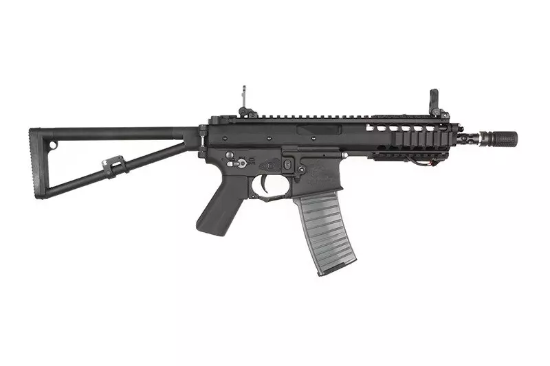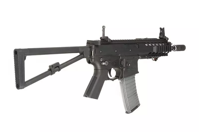 Replika wykonana jest w całości z elementów metalowych z wyłączeniem wykonanego z tworzywa chwytu pistoletowego i stalowego tłumika płomieni. Jest ona niewielkich rozmiarów, dzięki czemu świetnie będzie się sprawować podczas działań w warunkach CQB. Kolbę można złożyć na bok, co dodatkowo zwiększa kompaktowość repliki i ułatwia jej transportowanie. Magazynek typu Mid-Cap w standardzie Stanag mieści 120 kulek.