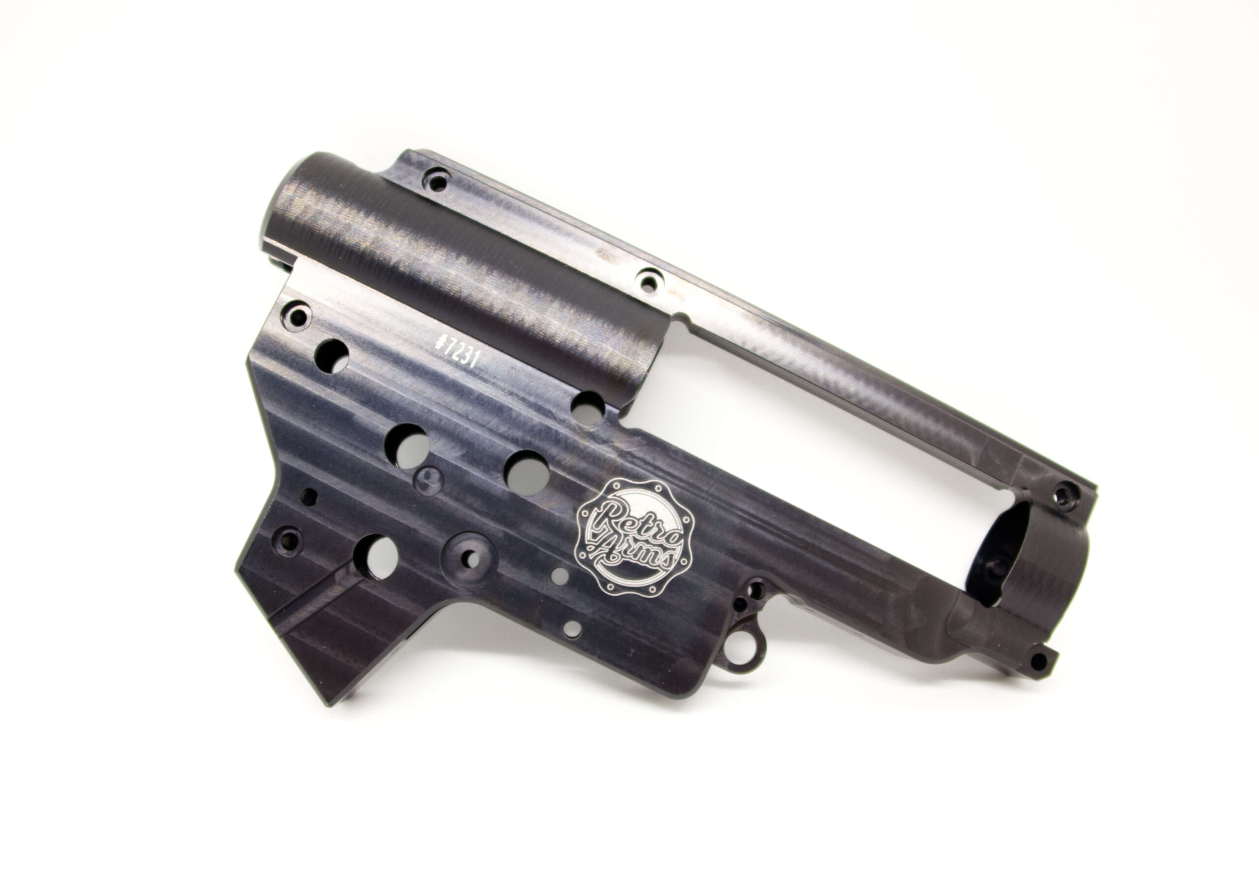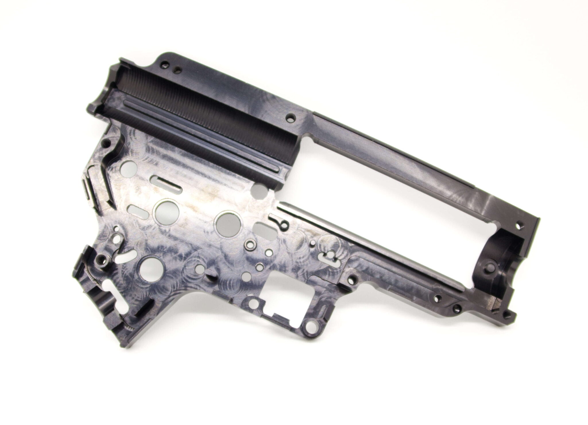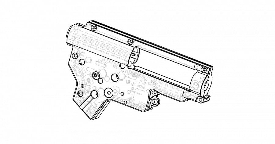 Ekstremalnie wytrzymały, wzmocniony szkielet gearboxa V2. Szkielet wykonany został w technologii CNC z trwałego aluminium 7075 T6. Szkielet został przystosowany do instalacji łożysk o średnicy 8mm oraz posiada system szybkiej wymiany sprężyny QSC.