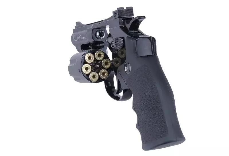 Magazynek stanowi bęben, do którego wkłada się atrapy 6 łusek o pojemności 1 kulki każda. Strzał można oddać poprzez naciśnięcie spustu lub wcześniejsze napięcie kurka. Po napięciu kurka spust działa lżej. Replika wyposażona jest również w szynę RIS 22mm znajdującą się nad lufą. Szyna mocowana jest na śrubę typu imbus i możliwe jest jej odkręcenie.
