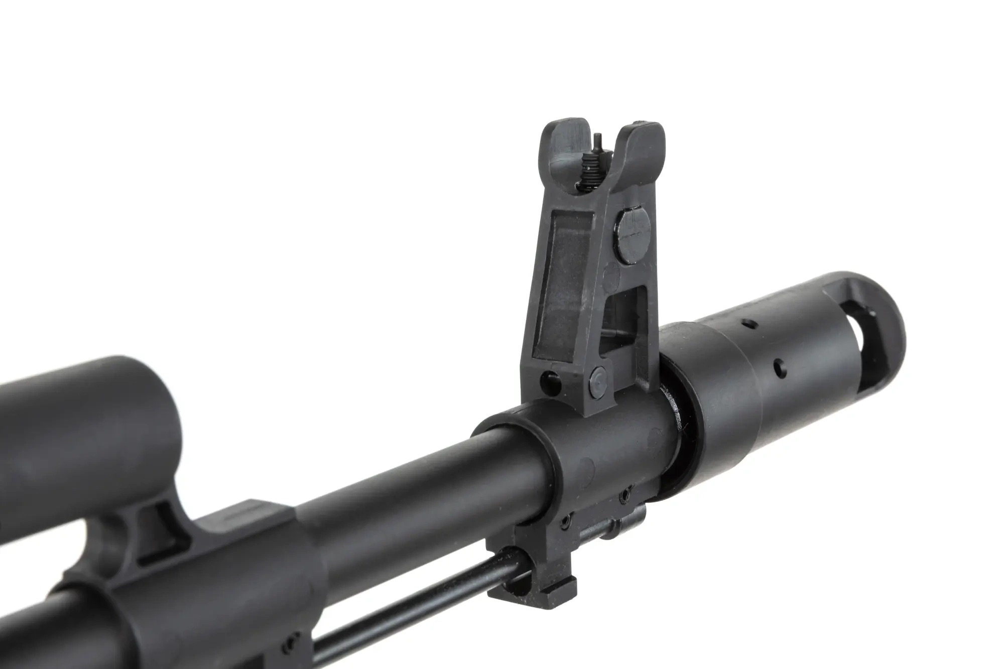 The Specna Arms AKS-74 (SA-J77 CORE(TM) HAL ETU Gen.2) replica stands out with its high-quality external nylon body, which features a matte finish and highly realistic appearance. Reinforced with glass fibers, the body is very durable and lightweight. Key parts such as the outer barrel, gas block, sights, and barrel mounts are made of metal, while various small parts and screws are even made of steel. The rifle has a polymer handguard and metal folding stock. The battery is placed under the dust cover, and stick-type batteries are recommended.Right out of the box, the AK comes with a 6.03 mm precision inner barrel, which improves accuracy and shot grouping. Gen.2 is newly equipped with an adjustable Magnus(TM) TDC hop-up chamber with a quality bucking. The ORION(TM) V3 gearbox, known for its reliability, is reinforced and supports springs up to M120 (as stated by manufacturer Specna Arms). It features a QSC quick spring change system (ESA2), allowing you to install a stronger or weaker spring as needed. To replace the spring, it is not necessary to dismantle the gearbox from the rifle body. Inside, you’ll find premium upgrade components such as 16:1 gear set, metal nozzle, and reinforced piston with 14.5 metal teeth. The gun is designed for S-MAG magazines (magazines from Cyma, JG, or E a L may also fit with minor adjustments).