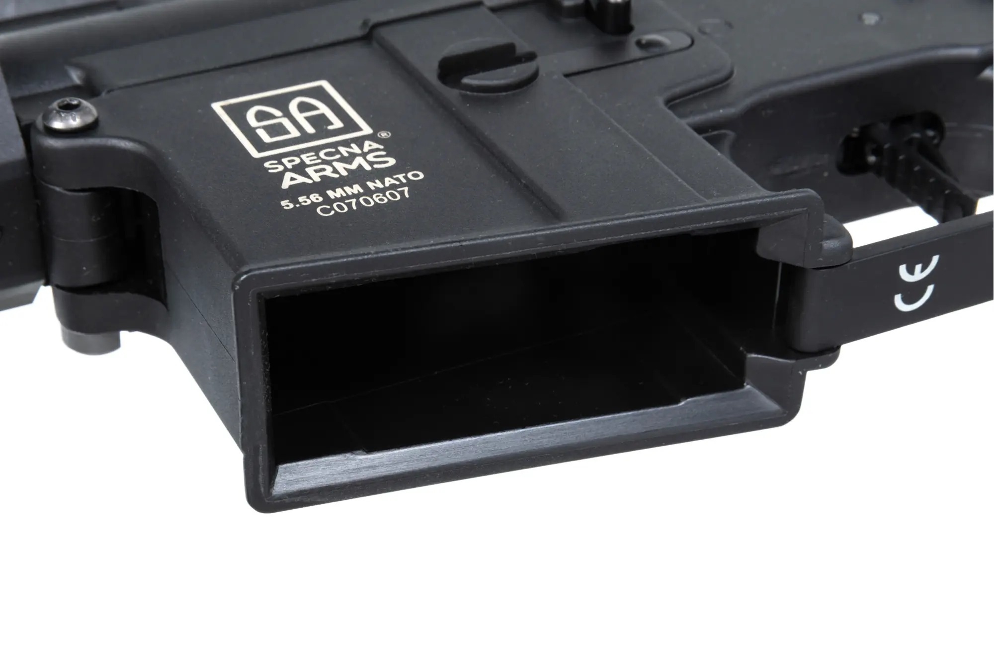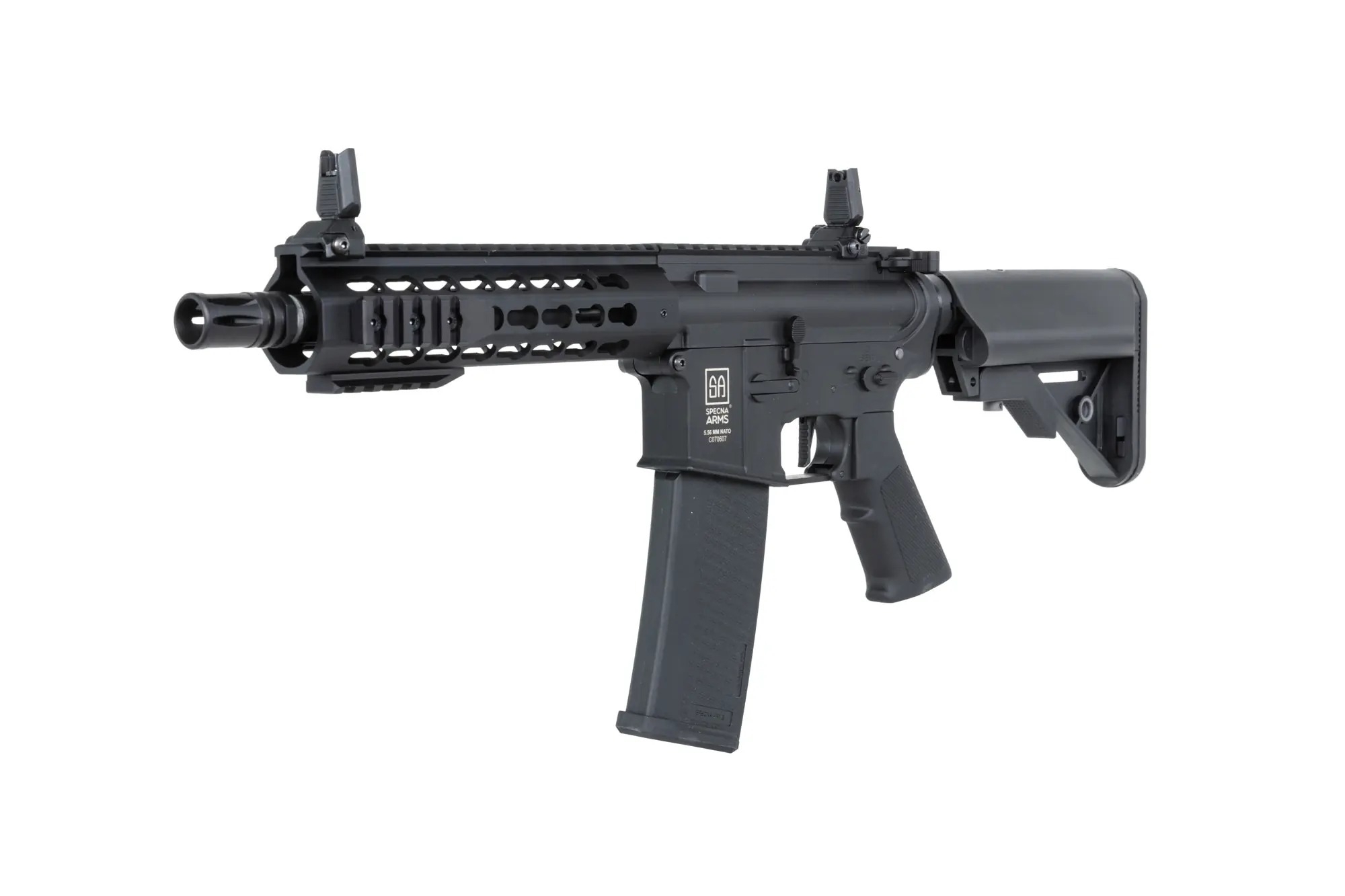 The Specna Arms M4 CQB Keymod Gen2 (SA-C08 CORE(TM) HAL ETU(TM)) replica stands out thanks to its high-quality external finish of the nylon body, which features a matte surface and delivers a very realistic look and feel. Thanks to reinforcement with fiberglass, the body is both lightweight and highly durable. The outer barrel is made of metal, while the screws, ejection port, and pins are even made of steel. The ergonomic AR15 design and modern construction ensure a comfortable grip and easy handling—this rifle simply feels right in your hands. The CNC metal Keymod handguard allows mounting various accessories such as a grip, AN/PEQ box, or flashlight. With the adjustable Crane-type stock, the rifle is ready for different game scenarios and allows the use of several battery types (Buffer Stick, Nunchuck, or Crane). Overall, this is a rifle that combines low weight, excellent internal components, and an attractive price. Inside, the M4 CQB Keymod Gen2 (SA-C08 CORE(TM) HAL ETU(TM)) is equipped with the HAL ETU(TM) electronic processor unit, which takes the rifle’s performance to a whole new level. With this upgrade, Specna Arms moves beyond the mid-range into the ranks of more premium brands offering cutting-edge technology as standard. The HAL name comes from the principle of the Hall effect, which allows the unit to precisely sense trigger input. It also increases the rate of fire and enables safe use of Li-Pol batteries 7.4V and 11.1V. The rifle also features a completely redesigned and reinforced gearbox designated ÆTHER, capable of handling AEG springs up to M140. Accuracy is ensured by a 6.03 mm precision inner barrel, paired with a Helium Flat-hop bucking installed in the redesigned MAGNUS(TM) chamber with a TDC pressure system. Also included is the ESA QSC quick spring change system, allowing you to install a stronger or weaker spring as needed. The spring can be changed without removing the gearbox from the body, simply through the buffer tube.