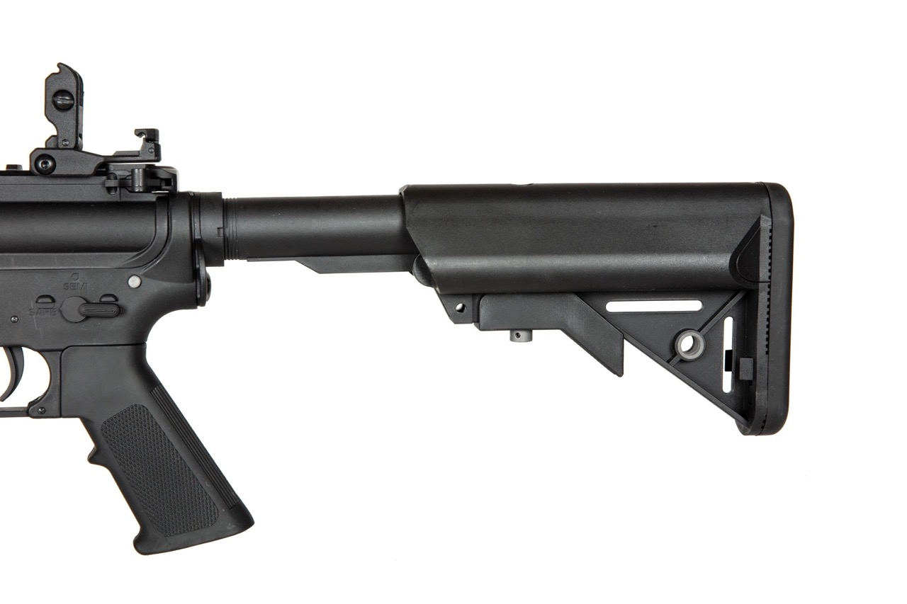 The M4 is a compact automatic rifle developed in the United States based on the popular M16 assault rifle. It was designed to meet the need for a lighter and shorter version of the M16, suitable for use in close quarters and urban combat. In the 1960s, the M16—developed by Armalite and adopted by the U.S. Army—became the base design for the M4. In the 1980s, the first M4 prototypes appeared, featuring a shorter barrel and a telescopic stock to improve maneuverability in confined spaces. In the 1990s, the M4 was officially adopted by the U.S. armed forces as the standard-issue carbine, replacing older models like the M3 and M9. The rifle is capable of both semi-automatic and full-auto fire, making it a versatile weapon.Thanks to its low weight, compactness, and reliability, the M4 quickly became popular among soldiers. It saw extensive use in conflicts such as the Iraq and Afghanistan wars and became an iconic weapon of modern U.S. military forces. In addition to the standard model, many M4 variants exist, equipped with various accessories and upgrades to meet the specific needs of military units.The airsoft AEG assault rifle M4 in the base FLEX(TM) series by Specna Arms focuses on lightweight nylon body without sacrificing excellent finish and fit. The fiberglass-reinforced body is more durable than common low-grade metal alloys, making it ideal not only for beginners but also for advanced players who prefer fast-paced gameplay like speedsoft, where every gram counts. This type of body is used in models like the CZ Scorpion Evo or MP7. The FLEX series is essentially the sibling of the CORE line, where the latter features CNC metal handguards, while the FLEX line comes with nylon handguards. The internal Gen2 parts are top-tier, as this model now includes a reinforced QSC gearbox AETHER(TM) V2 (same as in the high-end PRIME series) and a MAGNUS(TM) hop-up chamber with TDC pressure system. The trigger unit is powered by the Gate X-ASR MOSFET.