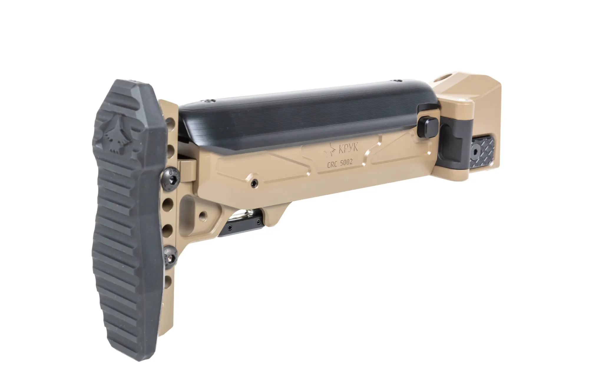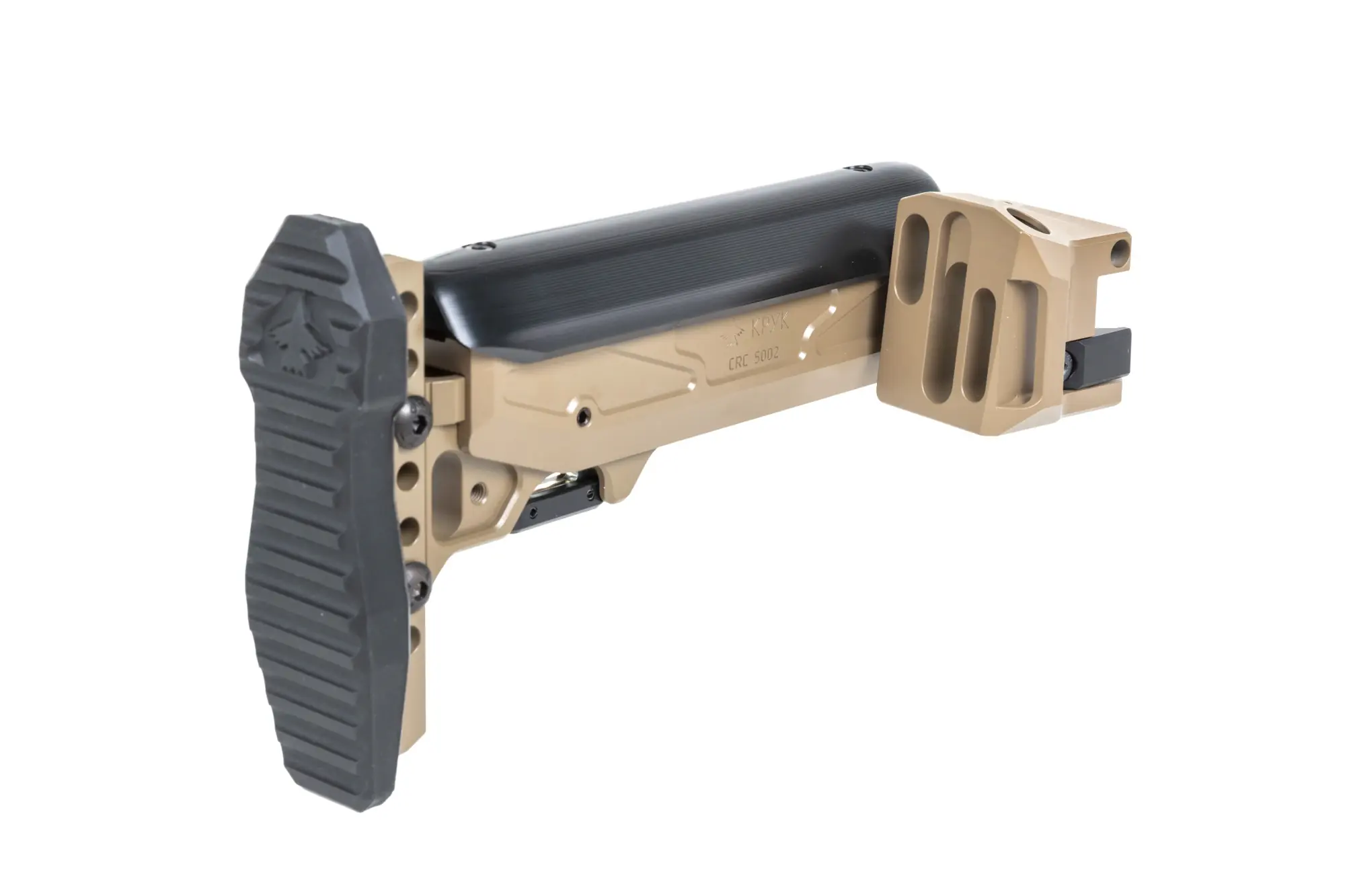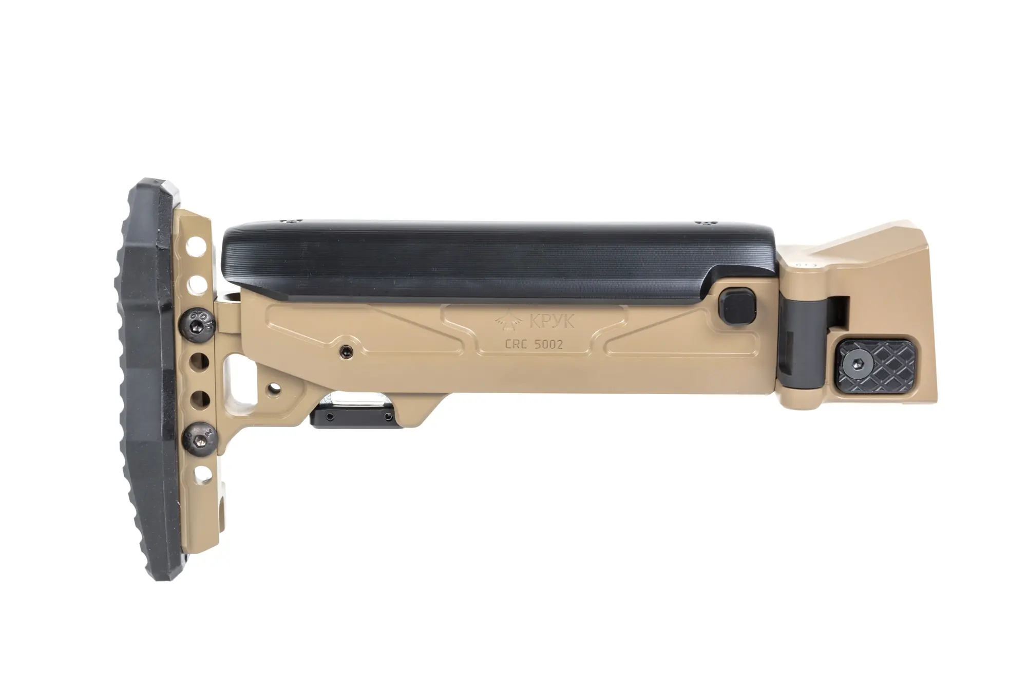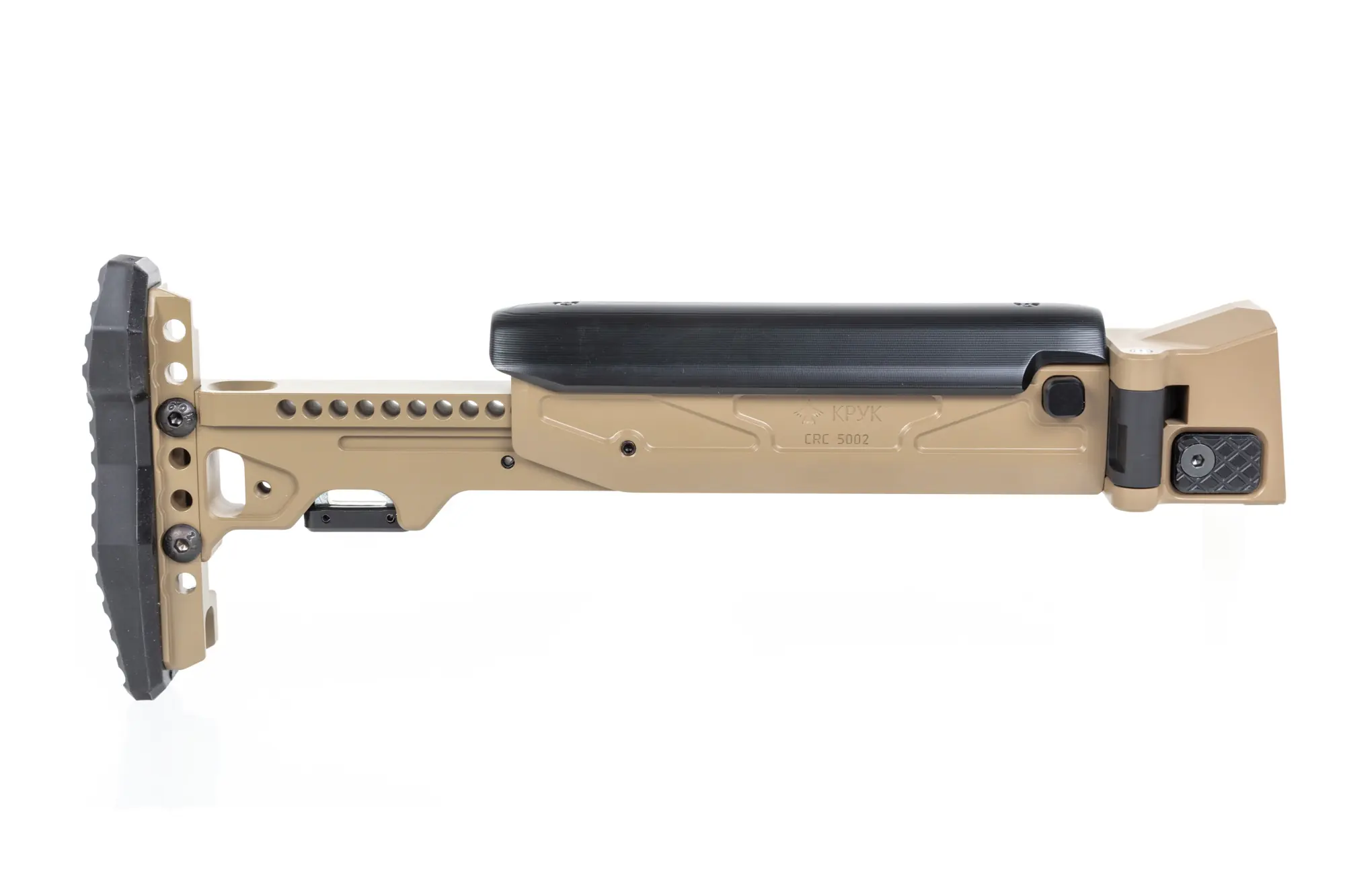 Model CRC 5002 został wykonany z wytrzymałego aluminium 6082, posiada regulacje w zakresie 15-22 cm oraz 4-stopniową regulację poliamidowej baki policzkowej oraz mocowanie QD. Kolba posiada powłokę z Cerakote. W zestawie dołączono również gumową stopkę kolby, która w znacznym stopniu zwiększy komfort użytkowania (kolba ma możliwość regulacji wysokości stopki +/- 3cm)