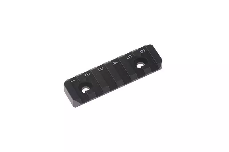 Wykonana z wytrzymałego i lekkiego aluminium szyna RIS posiadająca 6 slotów. Szynę zamontować można w szynach systemu Keymod/Mlok – w zestawie znajdują się śruby do obu systemów.