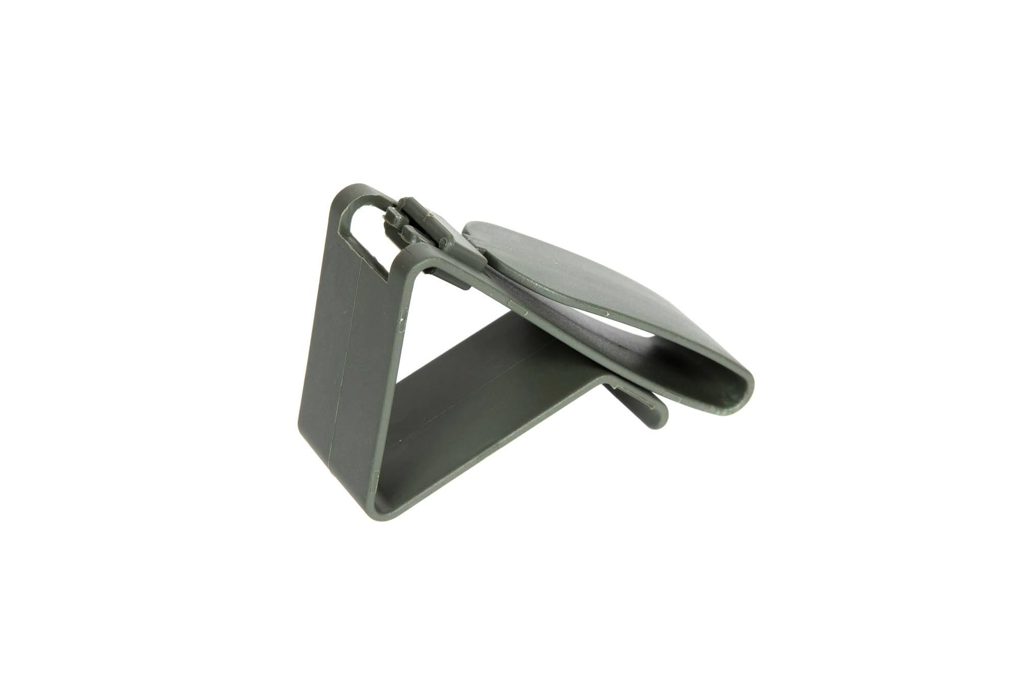 Uchwyt można zamocować na pasie lub innym dowolnym elemencie oporządzenia przy użyciu klipsa o szerokości 32mm, a następnie zawiesić na nim słuchawki dodatkowo zabezpieczając zatrzaskiem.