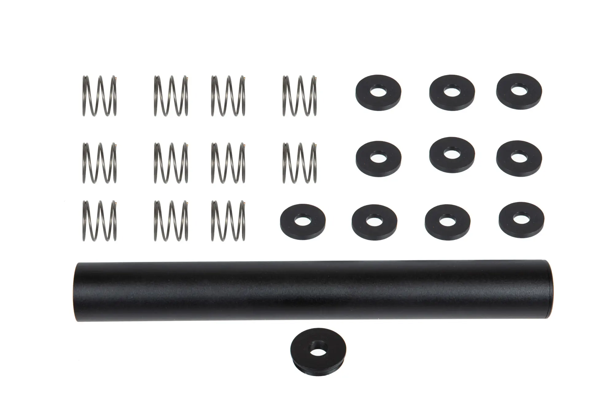 Tłumik wykonany z aluminium PA6 na tokarkach CNC, obustronnie zakończony gwintem 14 mm, tak prawo- jak i lewoskrętnym. Zaopatrzony w komory tłumiące z tworzywa i sprężyn zapewniające bardzo dobre właściwości tłumiące.