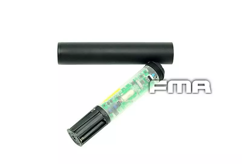 Tłumik dźwięku o długości 190mm i średnicy 35mm wyposażony w mechanizm naświetlający kulki. Aby tłumik działał efektywnie, niezbędne są fosforyzujące kulkitypu tracer.