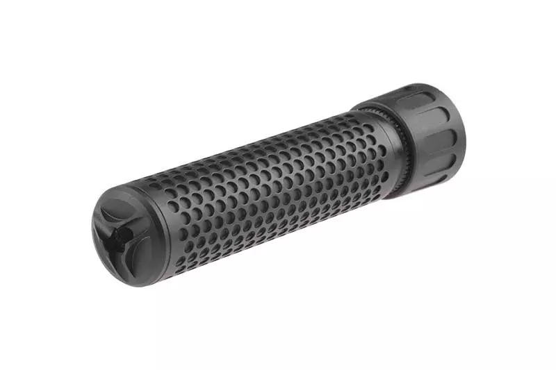 Tłumik zewnętrzny wykonany został z metalu. Dla zwiększenia zarówno wytrzymałości jak i estetyki poryto go czarną farbą w procesie proszkowania. Dzięki zastosowaniu 2 częściowej obudowy z perforowaną częścią zewnętrzną udało się uzyskać niezwykle realistyczny, głęboki efekt podnoszący jednocześnie realizm. Wewnątrz znajdziemy tłumik płomienia montowany w systemie QD z 14mm lewoskrętnym gwintem.