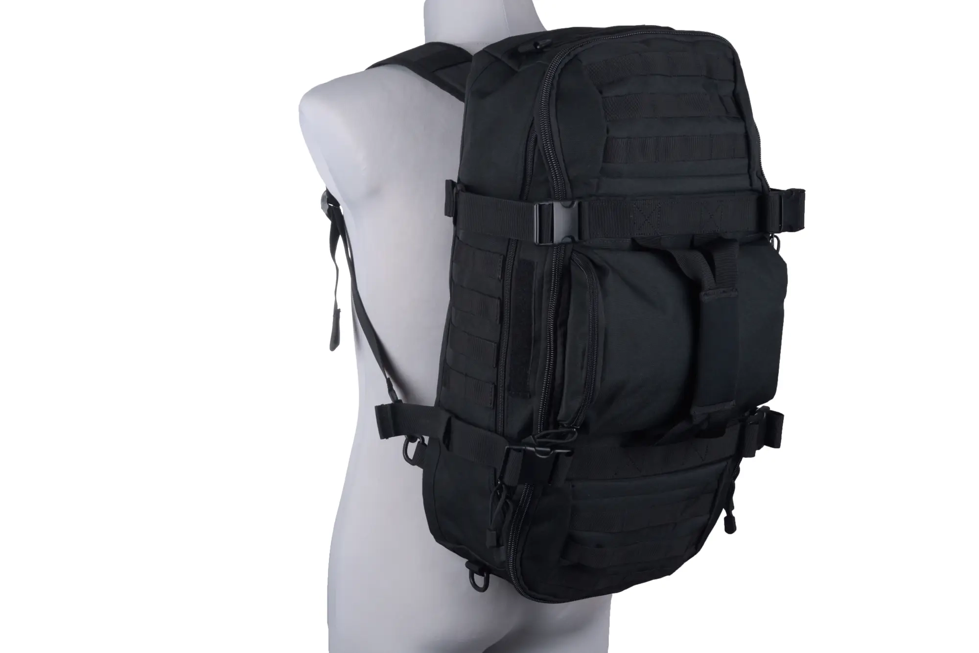 Na zewnątrz torba posiada po bokach dwie mniejsze ładownice zamykane na zamek błyskawiczny oraz jedną kieszeń, umieszczoną centralnie na środku także zamykaną na zamek błyskawiczny. Na środku także znajdziemy chwyt transportowy. W kilku miejscach torba obszyta jest palsami MOLLE co pozwoli na dopięcie dodatkowych ładownic, pasy kompresujące zaś pozwolą na dotroczenie np. kurtki lub zmniejszenie objętości torby.