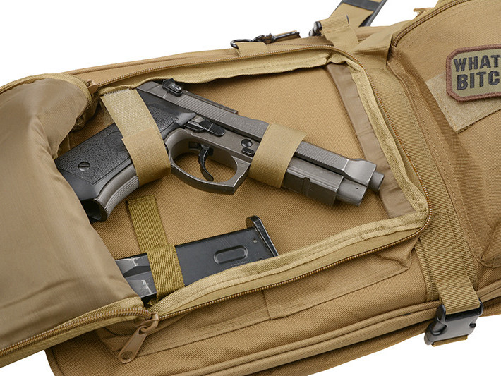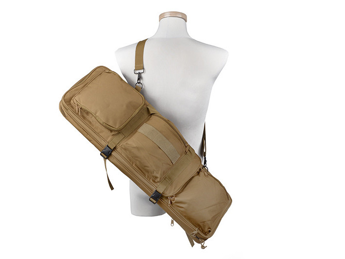 Main chamber will hold gun with lenght up to 800 mm (or 1100 mm with use of external hood) Secondary chamber will hold gun with lenght up to 580 mm Case has also pocket”s allowing for transport of magazine”s or other accesories Case may be transported in ordinary fasion with use of transport handle as well as typical backpack with attached suspenders.   Diameter: 84 x 30 cm